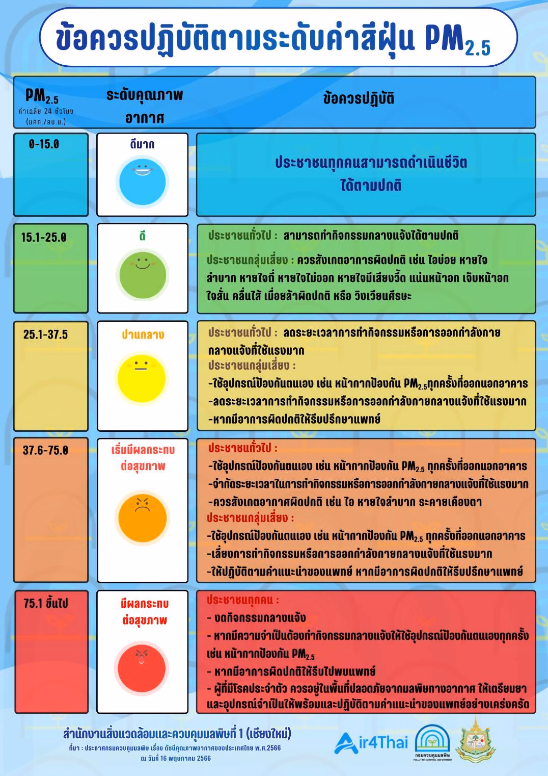 งดกิจกรรมกลางแจ้ง หากมีความจำเป็นต้องทำกิจกรรมกลางแจ้งให้ใช้อุปกรณ์ป้องกันตนเองทุกครั้งเช่น หน้ากากป้องกัน PM2.5 ประชาชนทั่วไป สวมหน้ากากป้องกัน PM2.5 ทุกครั้งที่ออกนอกอาคาร ลดระยะเวลาในการทำกิจกรรมหรืออกกำลังกายกลางแจ้ง สังเกตอาการผิดปกติ เช่น ไอ หายใจลำบาก ระคายเคืองตา