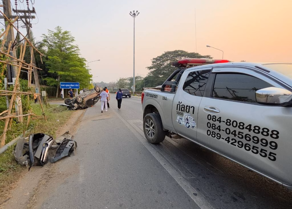 จากการสอบถามเบื้องต้น คนขับให้การว่า ขณะขับรถกลับบ้านเกิดอาการวูบหรือหลับใน ทำให้รถเสียหลักพุ่งชนเกาะกลางและเสาไฟฟ้า รู้สึกตัวอีกครั้งเมื่อรถพลิกคว่ำแล้ว โดยโชคดีที่คาดเข็มขัดนิรภัยจึงไม่ได้รับบาดเจ็บรุนแรง