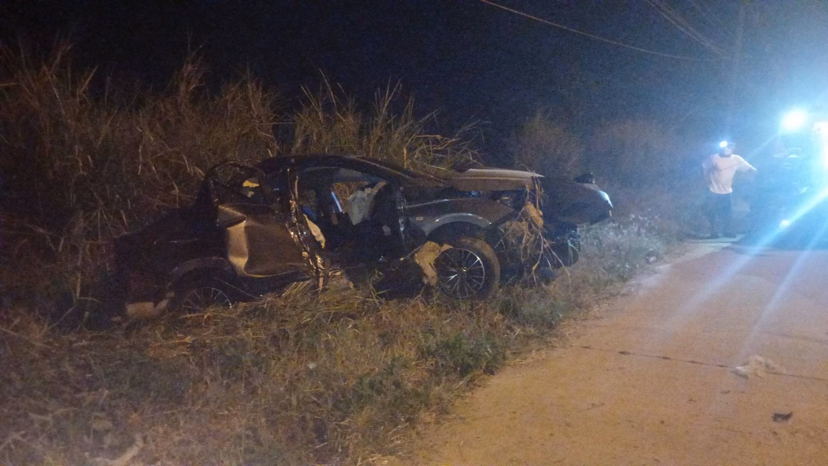 เมื่อเจ้าหน้าที่เดินทางถึงที่เกิดเหตุ พบรถยนต์เก๋งยี่ห้อฮอนด้า รุ่นซิตี้ สีเทา สภาพพังยับเยิน อัดก๊อปปี้ติดอยู่กับเสาไฟฟ้าข้างทาง แรงกระแทกทำให้ตัวรถฝั่งคนขับยุบตัวเสียหายอย่างหนัก โดยในจุดเกิดเหตุมีรถดับเพลิงจากเทศบาลตำบลแม่แฝกเข้าประจำการ เนื่องจากพบประกายไฟบริเวณตัวรถ