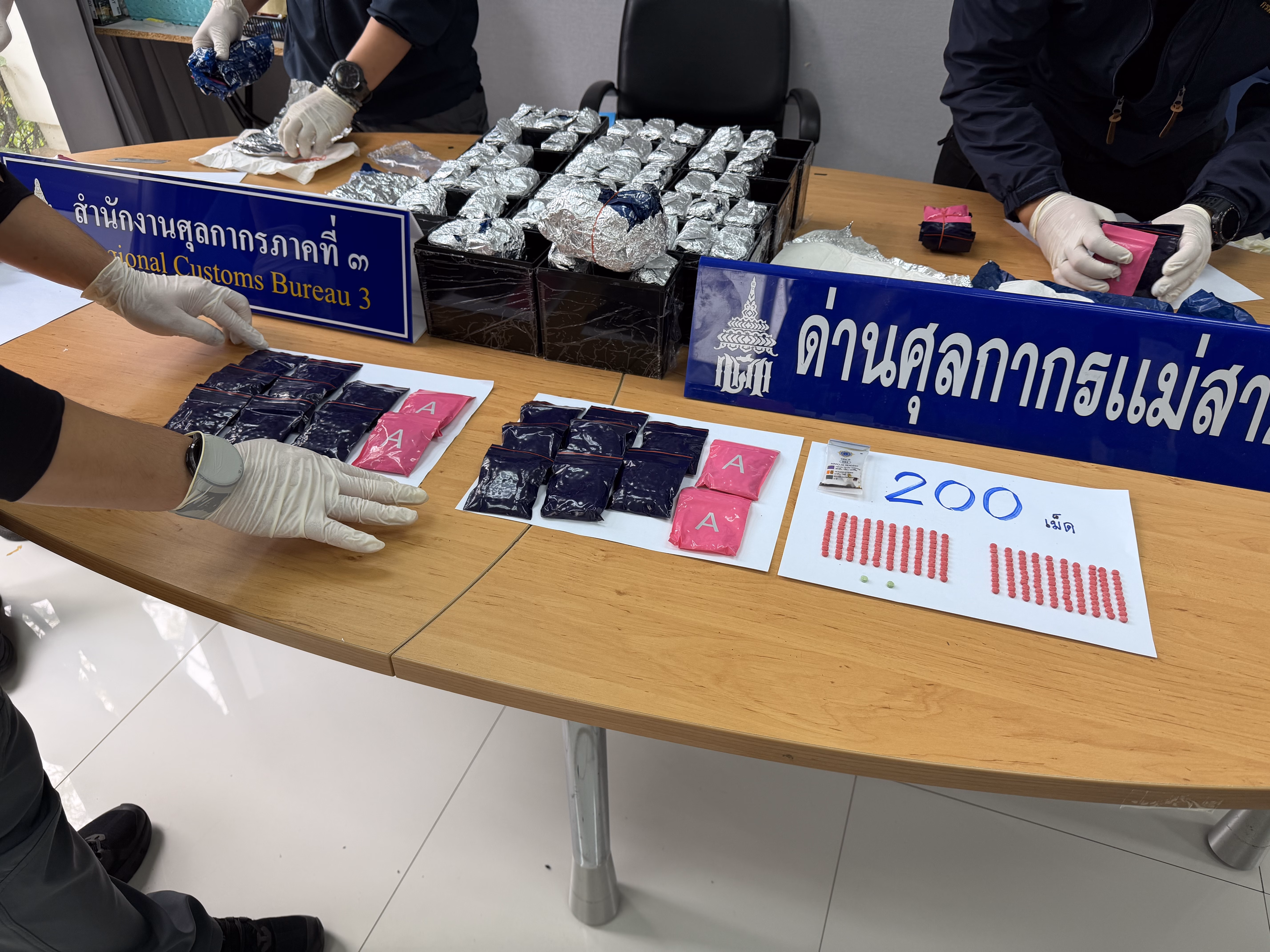 จากการตรวจสอบเบื้องต้นพบว่าน้ำหนักเบาผิดปกติ ลักษณะภายนอกมีรอยงัดแงะ ทางเจ้าหน้าที่จึงได้แกะตรวจสอบอย่างละเอียด ภายในพบสิ่งต้องสงสัย มีลักษณะเป็นเม็ดกลม สีส้ม พิมพ์ตัวอกษร WY รวมประมาณ 100,000 เม็ด ทดสอบด้วยชุดทดสอบ (Marquis Test) ผลทดสอบแสดงเป็นสีน้ำตาล บ่งชี้ว่าเป็นยาเสพติดให้โทษ ประเภท 1 เมทแอมเฟตามีน (ยาบ้า) เจ้าหน้าที่จึงทำการตรวจยึด นำของกลางส่งด่านศุลกากรแม่สาย เพื่อดำเนินการตามกฎหมายต่อไป