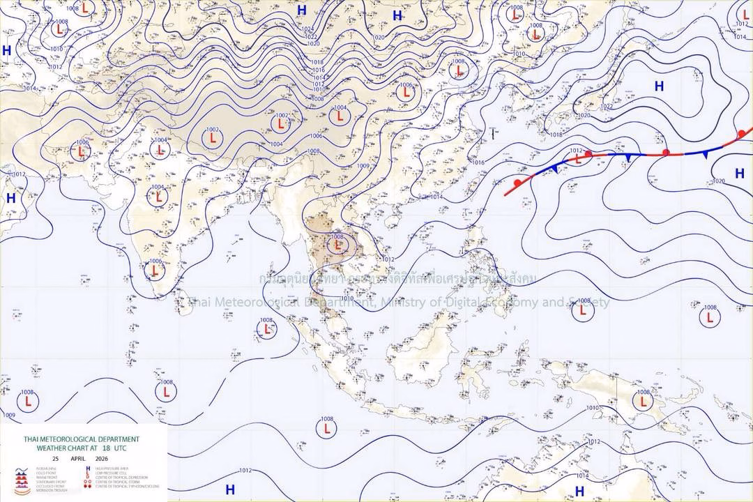 อนึ่ง ในช่วงวันที่ 28 เม.ย. – 1 พ.ค. 69 ประเทศไทยตอนบนจะมีพายุฤดูร้อนเกิดขึ้น โดยมีลักษณะของพายุฝนฟ้าคะนอง ลมกระโชกแรง และลูกเห็บตกบางแห่ง รวมถึงอาจมีฟ้าผ่าเกิดขึ้นได้ โดยจะเริ่มจากภาคตะวันออกเฉียงเหนือ ภาคเหนือ และภาคตะวันออกก่อน ส่วนภาคกลาง รวมทั้งกรุงเทพมหานครและปริมณฑลจะได้รับผลกระทบในระยะถัดไป เนื่องจากบริเวณความกดอากาศสูงหรือมวลอากาศเย็นจากประเทศจีนอีกระลอกหนึ่งจะแผ่ลงมาปกคลุมทะเลจีนใต้ และภาคตะวันออกเฉียงเหนือ ในขณะที่ประเทศไทยตอนบนมีอากาศร้อน