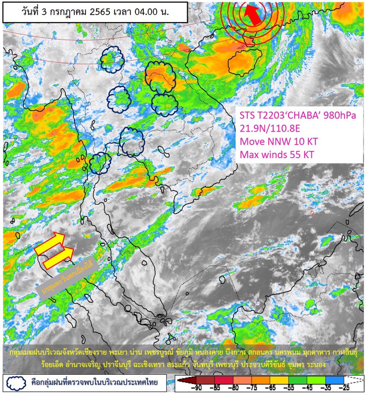 อนึ่ง พายุโซนร้อน “ชบา” (CHABA) ปกคลุมบริเวณประเทศจีนตอนใต้ คาดว่าจะอ่อนกำลังลงตามลำดับในระยะต่อไป โดยพายุนี้ไม่ส่งผลกระทบโดยตรงต่อลักษณะอากาศของประเทศไทย