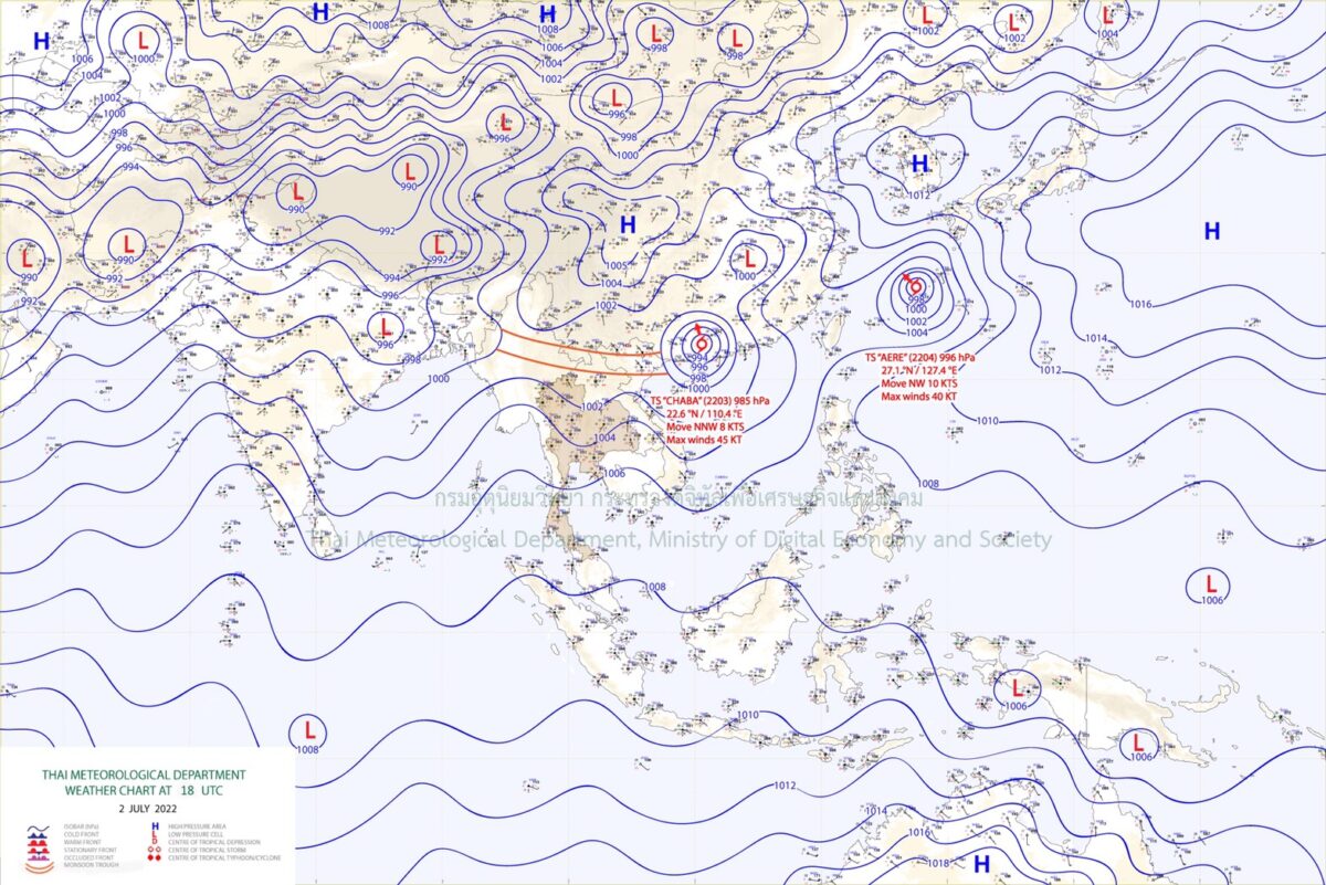 ลักษณะอากาศทั่วไป พยากรณ์อากาศ 24 ชั่วโมงข้างหน้า ประเทศไทยยังคงมีฝนตกต่อเนื่อง และมีฝนตกหนักบางแห่งบริเวณภาคเหนือตอนบน ภาคตะวันออกเฉียงเหนือ และภาคใต้ฝั่งตะวันตก โดยมีฝนตกหนักมากบางพื้นที่บริเวณภาคตะวันออก ขอให้ประชาชนในบริเวณดังกล่าวระวังอันตรายจากฝนตกหนักถึงหนักมากและฝนที่ตกสะสม ซึ่งอาจทำให้เกิดน้ำท่วมฉับพลันและน้ำป่าไหลหลากได้ ทั้งนี้เนื่องจากร่องมรสุมได้เลื่อนขึ้นไปพาดผ่านประเทศเมียนมา ตอนบนของภาคเหนือ และประเทศลาวตอนบน เข้าสู่พายุโซนร้อน “ชบา” (CHABA) ที่ปกคลุมบริเวณประเทศจีนตอนใต้ ประกอบกับมรสุมตะวันตกเฉียงใต้กำลังค่อนข้างแรงพัดปกคลุมทะเลอันดามัน ประเทศไทย และอ่าวไทย