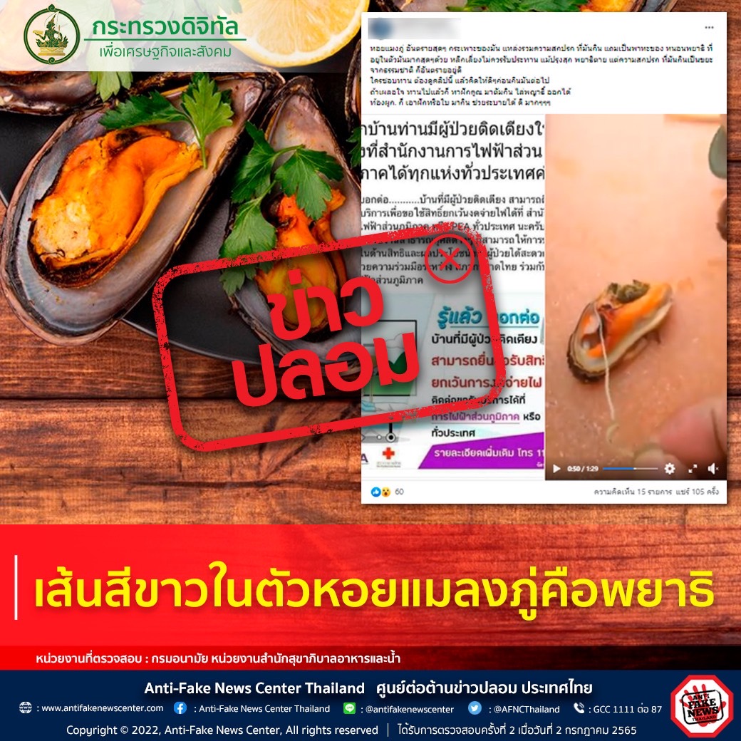 กรณีที่มีข้อความชวนเชื่อเรื่องเส้นสีขาวในตัวหอยแมลงภู่คือพยาธิ ทางศูนย์ต่อต้านข่าวปลอม กระทรวงดิจิทัลเพื่อเศรษฐกิจและสังคม ได้ดำเนินการตรวจสอบข้อเท็จจริงกับทางกรมอนามัย หน่วยงานสำนักสุขาภิบาลอาหารและน้ำ พบว่าประเด็นดังกล่าวนั้น เป็นข้อมูลเท็จ