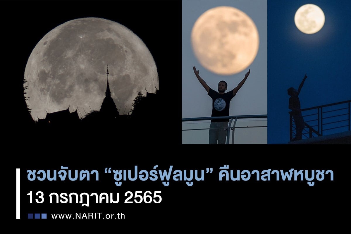 สถาบันวิจัยดาราศาสตร์แห่งชาติ (องค์การมหาชน) (สดร.) กระทรวงการอุดมศึกษา วิทยาศาสตร์ วิจัยและนวัตกรรม (อว.) เผยคืนอาสาฬหบูชา 13 กรกฎาคม 2565 “ดวงจันทร์เต็มดวงใกล้โลกที่สุดในรอบปี” มีขนาดปรากฏใหญ่และสว่างกว่าปกติเล็กน้อย เตรียมจัดสังเกตการณ์ 4 จุดหลักที่ เชียงใหม่ นครราชสีมา ฉะเชิงเทรา และสงขลา ชวนดูดาวชมจันทร์ ฟรี! ไม่มีค่าใช้จ่าย