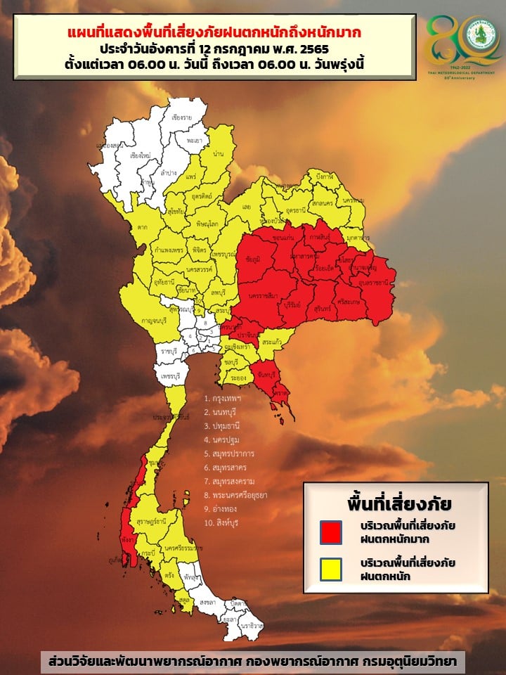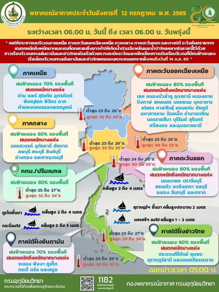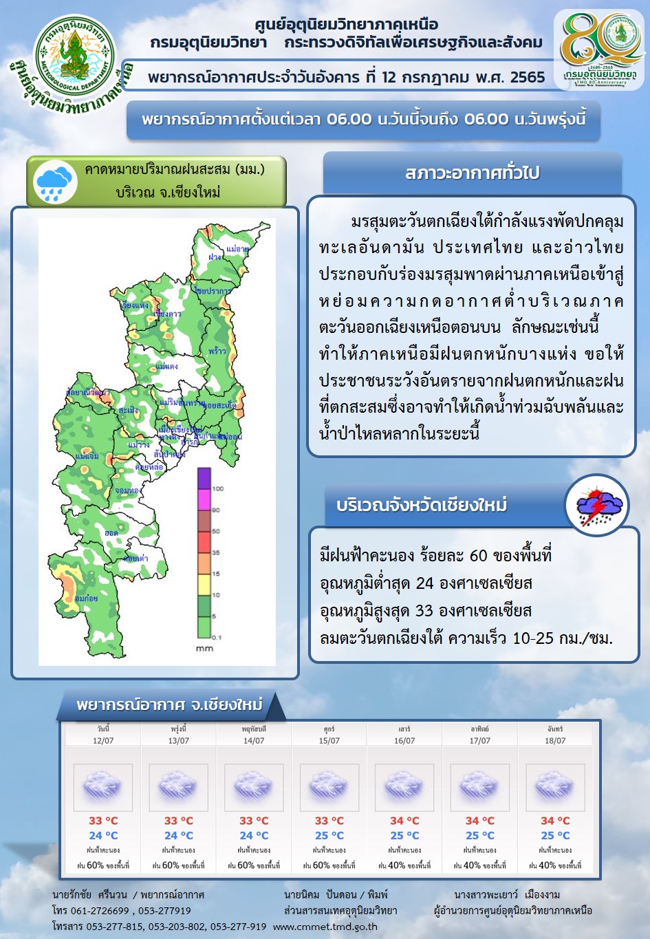 ในช่วงวันที่ 12-14 ก.ค. 65 มรสุมตะวันตกเฉียงใต้กำลังแรง พัดปกคลุมทะเลอันดามัน ประเทศไทย และอ่าวไทย ประกอบกับร่องมรสุมพาดผ่านภาคเหนือ เข้าสู่หย่อมความกดอากาศต่ำ บริเวณภาคตะวันออกเฉียงเหนือตอนบน ทำให้ภาคเหนือมีฝนตกหนักถึงหนักมากบางแห่ง