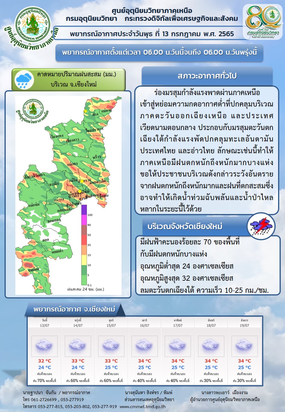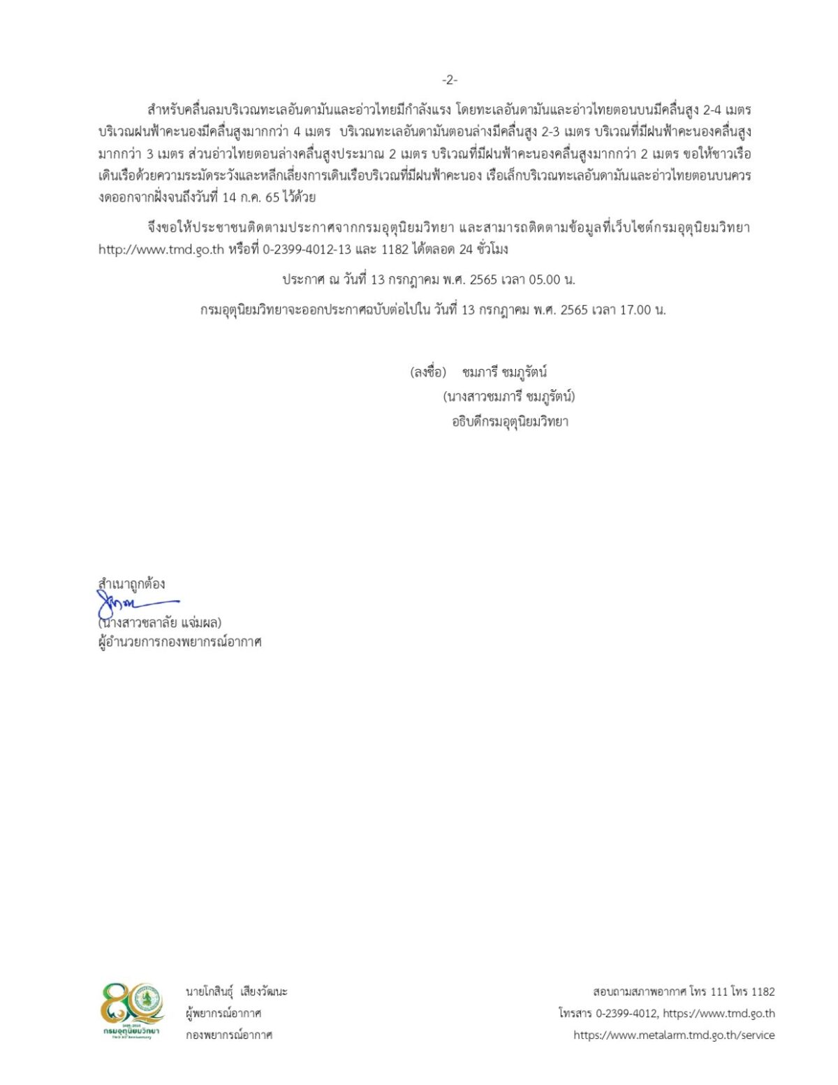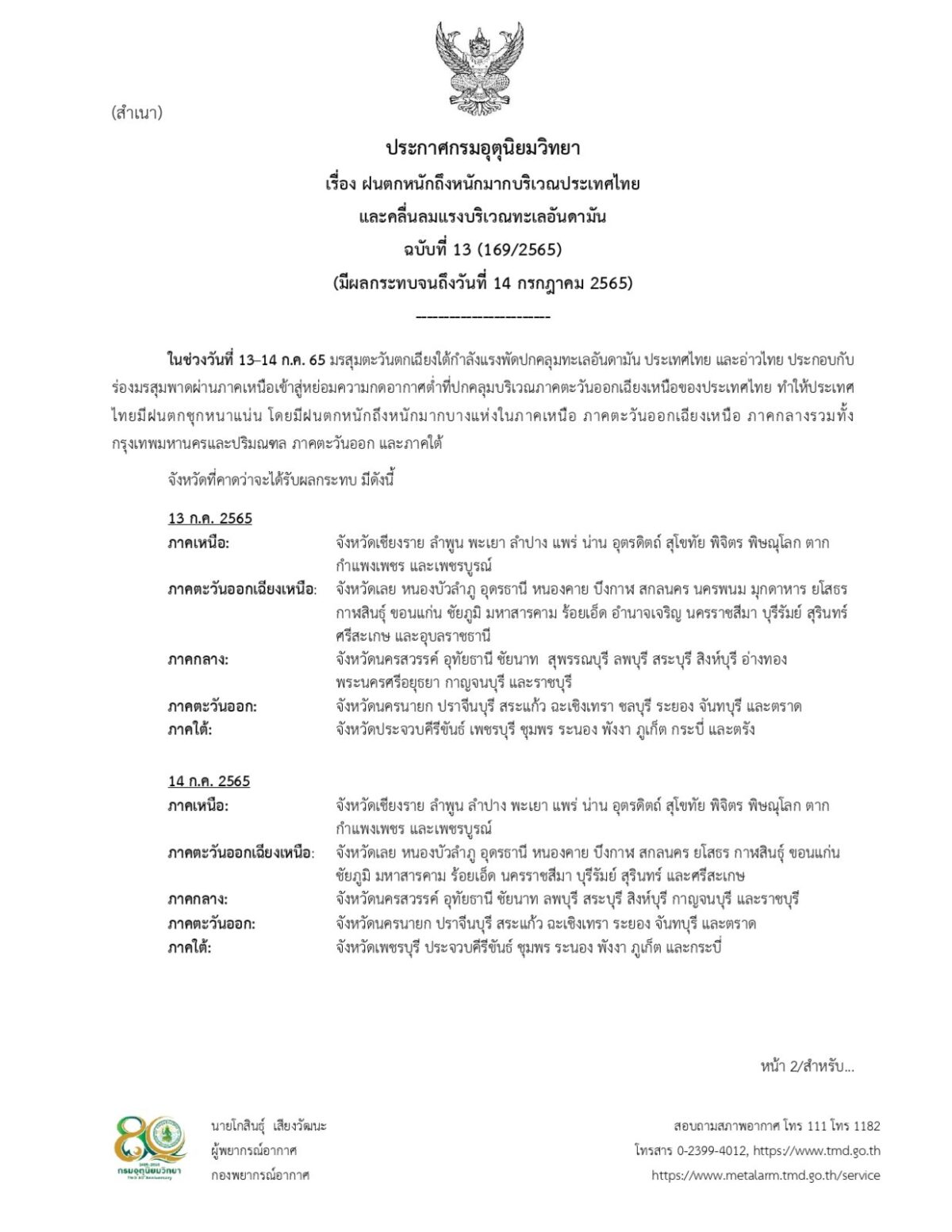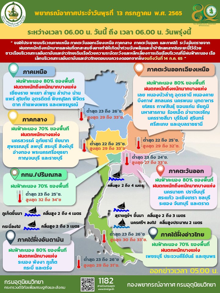 ประกาศกรมอุตุนิยมวิทยา เรื่อง ฝนตกหนักถึงหนักมากบริเวณประเทศไทย และคลื่นลมแรงบริเวณทะเลอันดามัน ฉบับที่ 13 (169/2565) มีผลกระทบจนถึงวันที่ 14 กรกฎาคม 2565