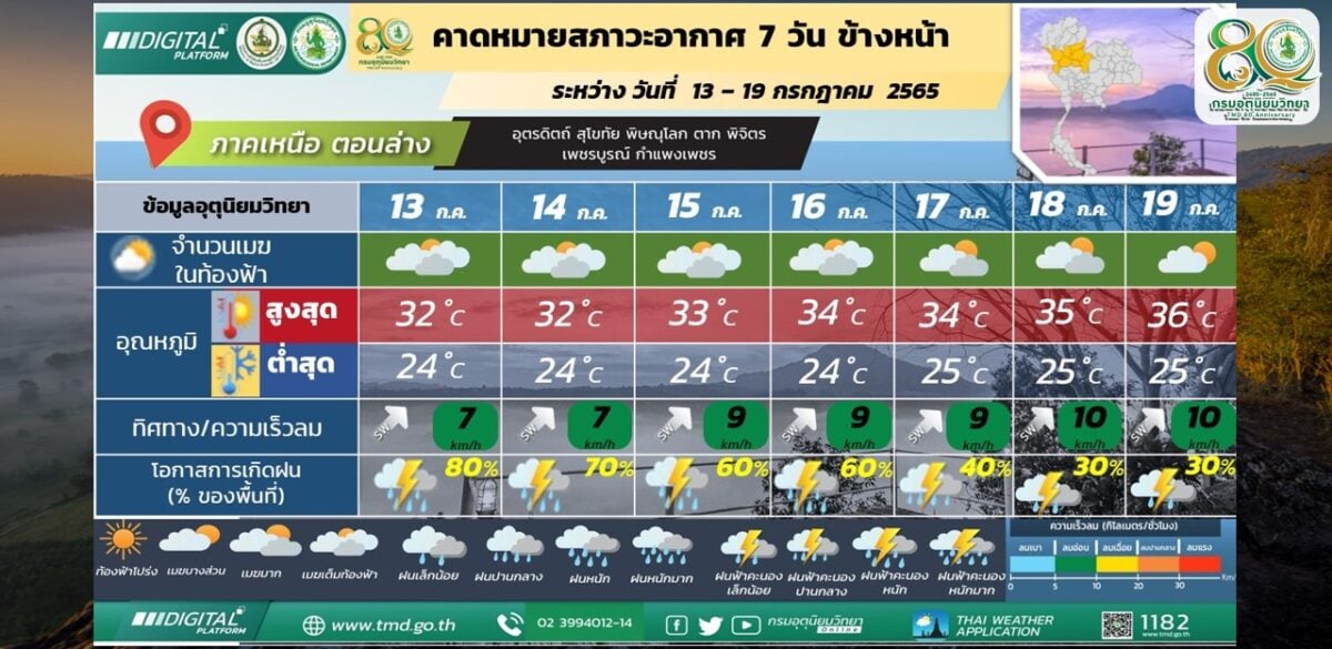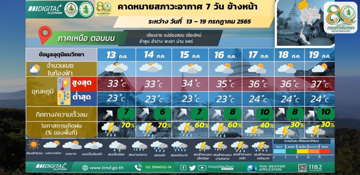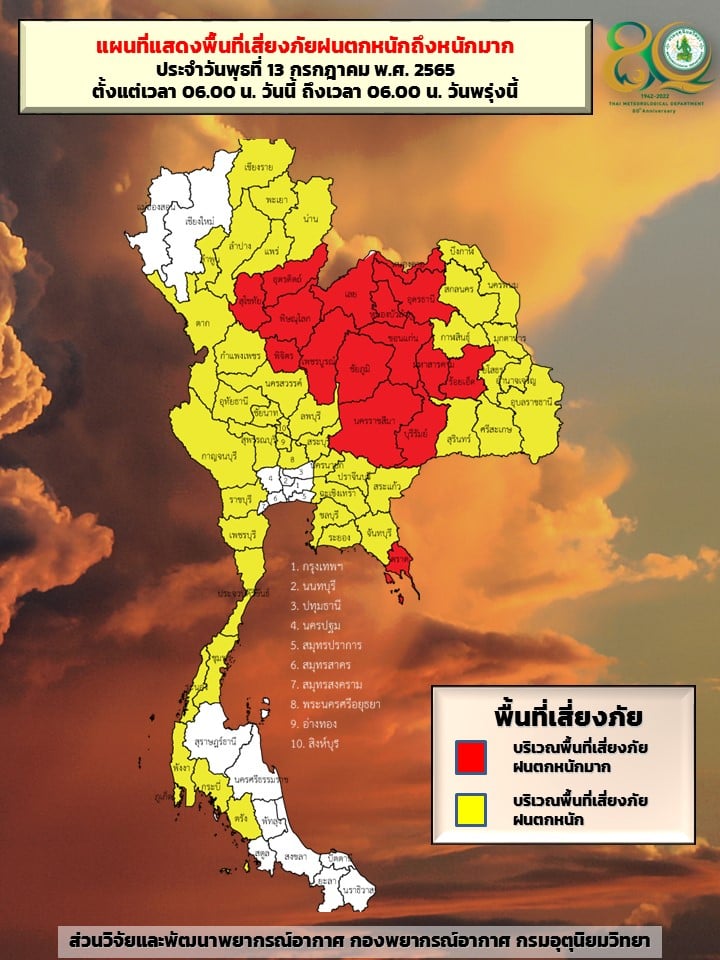 ในช่วงวันที่ 13-14 ก.ค. 65 มรสุมตะวันตกเฉียงใต้กำลังแรงพัดปกคลุมทะเลอันดามัน ประเทศไทย และอ่าวไทย ประกอบกับร่องมรสุมพาดผ่านภาคเหนือเข้าสู่หย่อมความกดอากาศต่ำที่ปกคลุมบริเวณภาคตะวันออกเฉียงเหนือของประเทศไทย ทำให้ประเทศไทยมีฝนตกซุกหนาแน่น โดยมีฝนตกหนักถึงหนักมากบางแห่งในภาคเหนือ ภาคตะวันออกเฉียงเหนือ ภาคกลางรวมทั้งกรุงเทพมหานครและปริมณฑล ภาคตะวันออก และภาคใต้