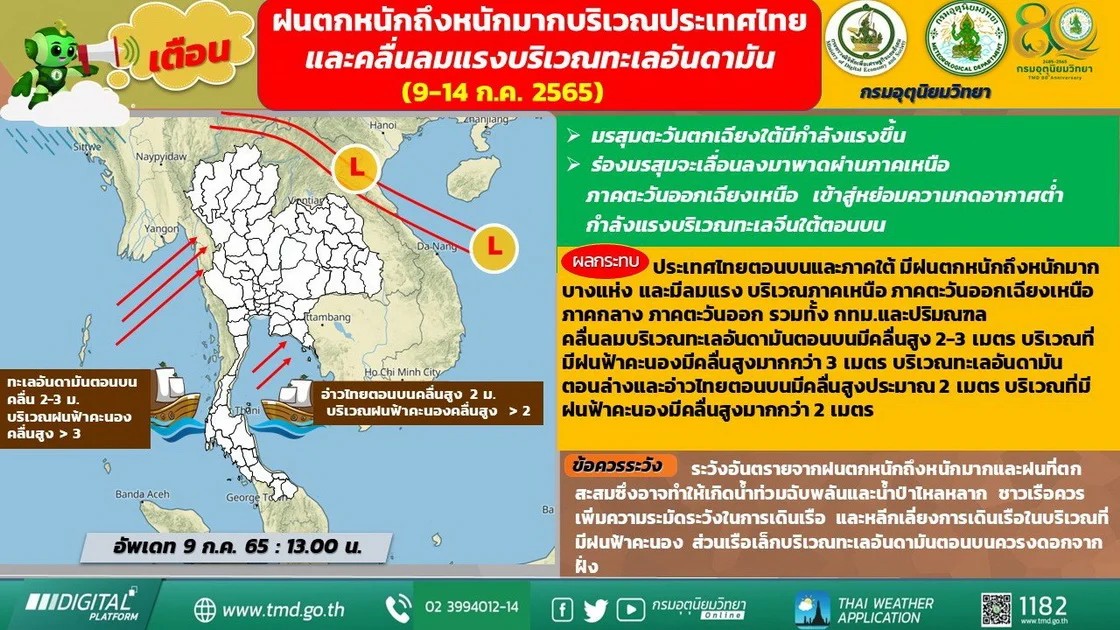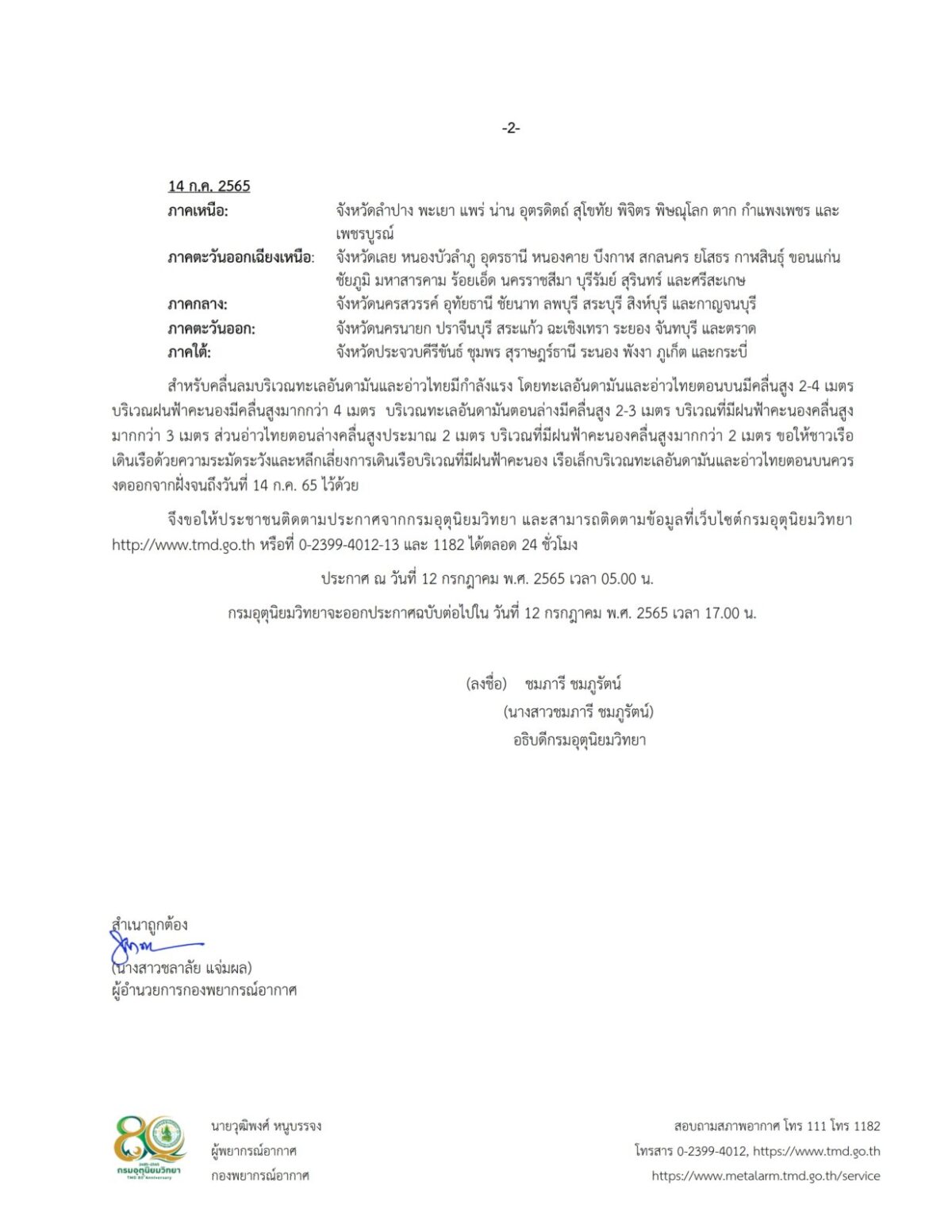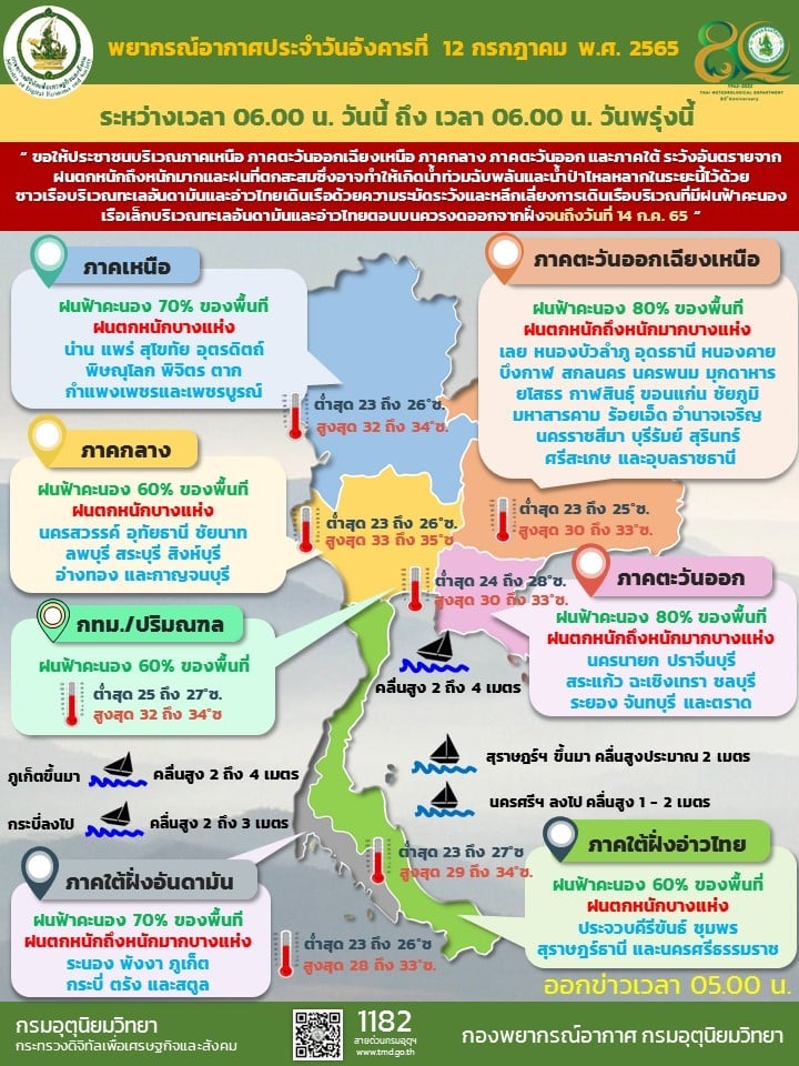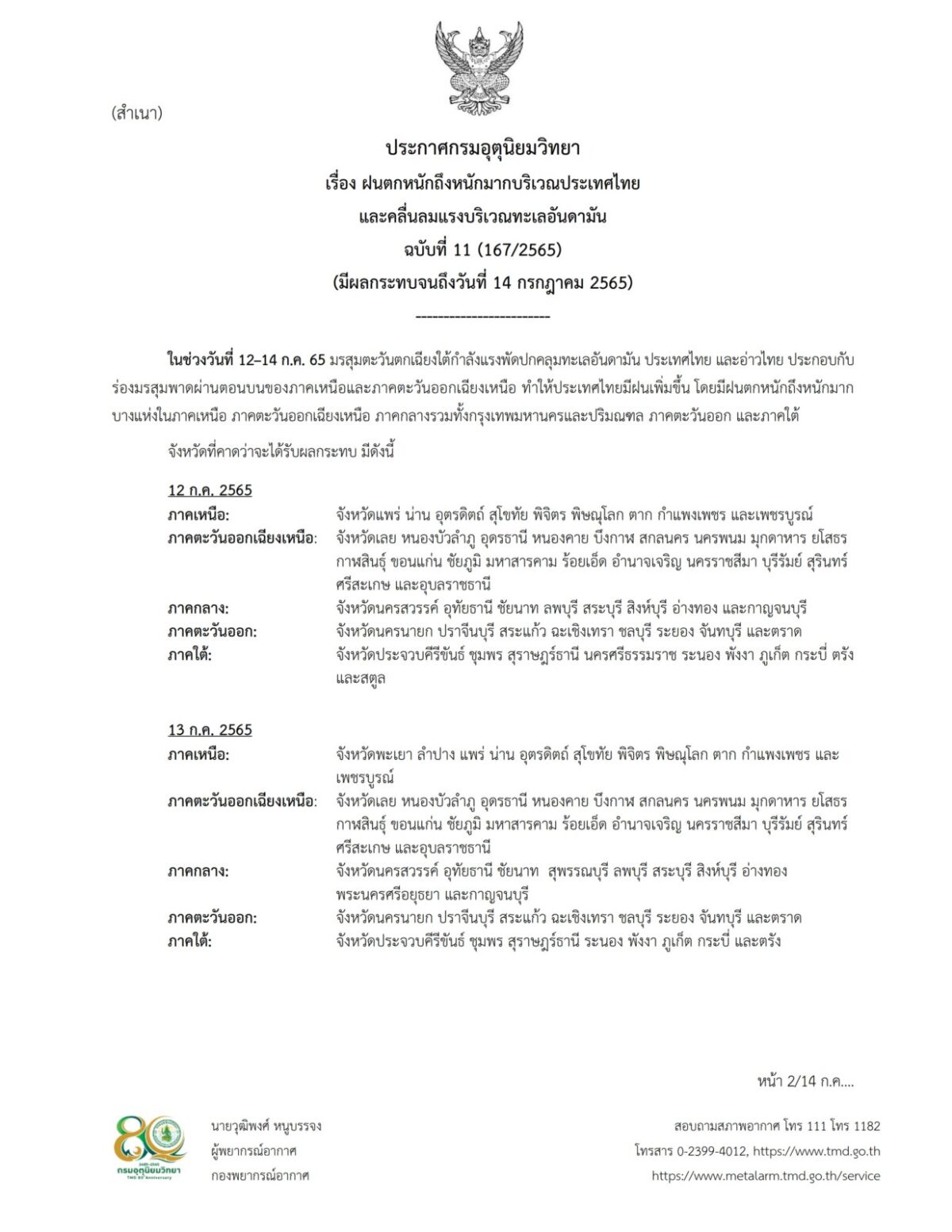 ตามที่กรมอุตุนิยมวิทยา ได้ประกาศเตือน ในช่วงวันที่ 12-14 กรกฎาคม 2565 มรสุมตะวันตกเฉียงใต้กำลังแรงพัดปกคลุมทะเลอันดามัน ประเทศไทย และอ่าวไทย ประกอบกับ ร่องมรสุมพาดผ่านตอนบนของภาคเหนือและภาคตะวันออกเฉียงเหนือ ลักษณะเช่นนี้ ทำให้ประเทศไทยจะมีฝนเพิ่มขึ้น โดยมีฝนตกหนัก ถึงหนักมากบางแห่ง บริเวณภาคเหนือ ภาคตะวันออกเฉียงเหนือ ภาคกลาง รวมทั้งกรุงเทพมหานครและปริมณฑล ภาคตะวันออก และภาคใต้ โดยขอให้ประชาชนบริเวณประเทศไทยตอนบน โดยเฉพาะในพื้นที่จังหวัดลำปาง พะเยา แพร่ น่าน อุตรดิตถ์ สุโขทัย พิจิตร พิษณุโลก ตาก กำแพงเพชร และเพชรบูรณ์ ระวังอันตรายจากฝนตกหนัก ถึงหนักมาก และฝนที่ตกสะสม ซึ่งอาจทำให้เกิดน้ำท่วมฉับพลันและน้ำป่าไหลหลากที่จะเกิดขึ้น รวมทั้งเพิ่มความระมัดระวังในการสัญจรผ่านบริเวณที่มีฝนฟ้าคะนอง ในห้วงดังกล่าวด้วย