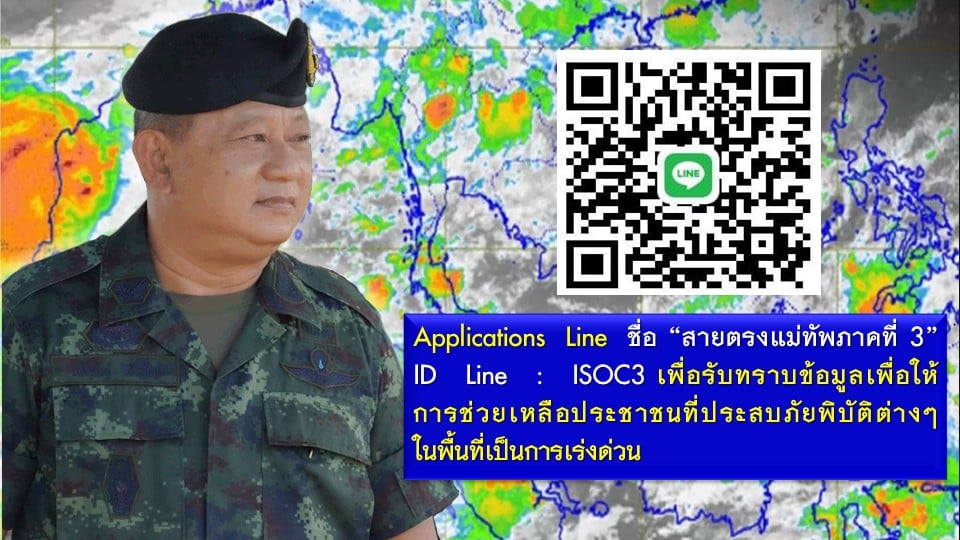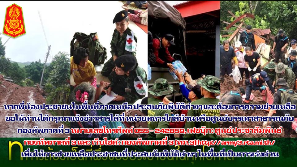 ทั้งนี้ หากพี่น้องประชาชนในพื้นที่ภาคเหนือ ประสบภัยพิบัติต่างๆ และต้องการความช่วยเหลือ ขอให้ท่านได้กรุณาแจ้งข่าวสารได้ที่ หน่วยทหารใกล้บ้าน หรือศูนย์บรรเทาสาธารณภัย กองทัพภาคที่ 3 หมายเลขโทรศัพท์ 055 – 242859, เฟซบุ๊ก : ศูนย์ประชาสัมพันธ์ กองทัพภาคที่ 3 และ เว็บไซต์ : กองทัพภาคที่ 3 (ทภ.3) http://army3.rta.mi.th/ รวมทั้ง สามารถส่งข้อมูลผ่านระบบ Application Line ชื่อ “สายตรงแม่ทัพภาคที่ 3” ID Line : ISOC3 เพื่อรับทราบข้อมูล เพื่อให้การช่วยเหลือประชาชนที่ประสบภัยพิบัติต่างๆ ในพื้นที่เป็นการเร่งด่วน