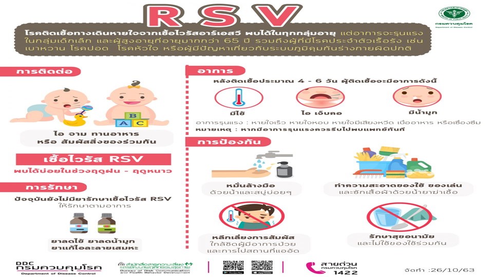 สำหรับการป้องกันโรคติดเชื้อทางเดินหายใจ จากเชื้อไวรัสอาร์เอสวี (RSV) ในปัจจุบันยังไม่มีวัคซีนป้องกันโรค ขอแนะนำผู้ปกครอง และสถานศึกษาควรสังเกตอาการบุตรหลาน และเด็กนักเรียน อย่างใกล้ชิด โดยเฉพาะเด็กอายุต่ำกว่า 5 ปี ระวังป่วยด้วยโรคติดเชื้อทางเดินหายใจ จากเชื้อไวรัสอาร์เอสวี (RSV) โดยเฉพาะขณะนี้มีฝนตกในหลายพื้นที่ ทั้งนี้ สามารถปฏิบัติตัวเพื่อป้องกันการติดเชื้อและลดการแพร่กระจายของเชื้อไวรัส ให้เด็กล้างมือบ่อยๆ ด้วยสบู่และน้ำสะอาด โดยเฉพาะก่อนมื้ออาหาร หลังเข้าห้องน้ำ และหลังเล่นของเล่น ไม่ใช้แก้วน้ำหรือของใช้ส่วนตัวร่วมกับผู้อื่น รักษาสุขอนามัยส่วนตัว หลีกเลี่ยงการสัมผัสผู้ที่ติดเชื้อและการไปในสถานที่ที่ ผู้คนหนาแน่น ไม่ควรพาเด็กไปเล่นในที่ที่มีเด็กเล่นอยู่ด้วยกันจำนวนมาก ส่วนผู้ที่ป่วยควรงดการออกนอกบ้าน ในช่วงที่ไม่สบาย เพื่อลดการแพร่กระจายเชื้อไปยังผู้อื่น และควรปิดปากปิดจมูกเวลาไอจามด้วยหน้ากากผ้า หรือหน้ากากอนามัย ทำความสะอาดบ้าน รวมทั้งของเล่นเด็กเป็นประจำ ควรรับประทานอาหารที่ถูกสุขลักษณะ ดื่มน้ำมากๆ และให้เด็กพักผ่อนให้เพียงพอ หากเด็กมีอาการป่วยเป็นไข้หวัด ควรแยกเด็กออกจากเด็กปกติ เพื่อเป็นการป้องกันการแพร่เชื้อและพาไปพบแพทย์เพื่อรับการวินิจฉัยและรักษาต่อไป