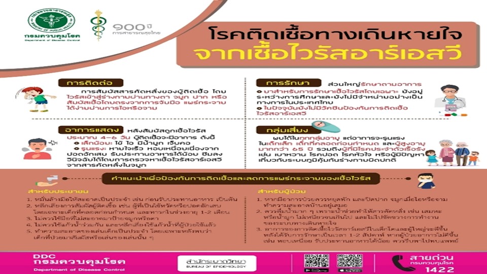 โรคติดเชื้อไวรัสอาร์เอสวี (RSV) ติดต่อได้จากการสัมผัสสารคัดหลั่งของผู้ติดเชื้อ โดยไวรัสเข้าสู่ร่างกายผ่านทางตา จมูก ปาก และจากการสูดหายใจ เอาเชื้อที่อยู่ในอากาศในรูปละอองฝอยจากการไอ จามของผู้ป่วย โดยผู้ป่วยส่วนใหญ่จะแสดงอาการหลังสัมผัสถูกเชื้อไวรัสในระยะเวลา 4-6 วัน และเมื่อป่วยจะสามารถแพร่กระจายเชื้อได้นาน 3-8 วัน อาการโดยทั่วไปอาจจะเหมือนไข้หวัดธรรมดา แต่อาการจำเพาะของเชื้อนี้ มักพบในเด็กเล็ก คือ หลอดลมฝอยอักเสบ โดยเริ่มแรกจะมีอาการเพียงเล็กน้อย เช่น ไข้ ไอ มีน้ำมูก เจ็บคอ จนถึงอาการรุนแรง เช่น หายใจหอบเหนื่อย อกบุ๋ม ได้ยินเสียงปอดผิดปกติ เสียงหายใจมีเสียงหวีด รับประทานอาหารได้น้อย และซึมลง ซึ่งการรักษาส่วนใหญ่เป็นการรักษาตามอาการ โรคนี้สามารถพบได้ในผู้ป่วยทุกกลุ่มอายุ แต่อาการจะรุนแรงในเด็กเล็ก เด็กที่คลอดก่อนกำหนด และกลุ่มผู้สูงอายุ 65 ปีขึ้นไป รวมถึงผู้ที่มีโรคประจำตัวเรื้อรัง เช่น เบาหวาน โรคปอด โรคหัวใจ หรือมีปัญหาเกี่ยวกับระบบภูมิคุ้มกันร่างกายผิดปกติ เป็นต้น
