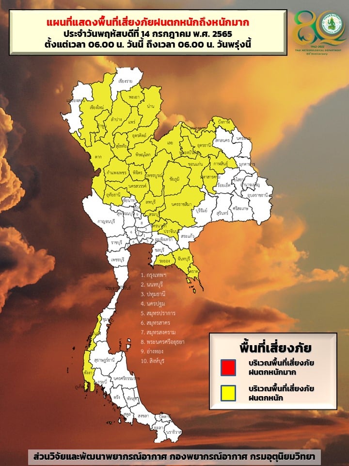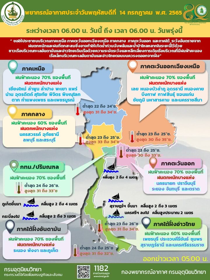 ในวันที่ 14 ก.ค. 65 มรสุมตะวันตกเฉียงใต้กำลังแรง พัดปกคลุมทะเลอันดามัน ประเทศไทย และอ่าวไทย ประกอบกับร่องมรสุมพาดผ่านภาคเหนือ เข้าสู่หย่อมความกดอากาศต่ำ ที่ปกคลุมบริเวณภาคตะวันออกเฉียงเหนือของประเทศไทย ทำให้ประเทศไทยมีฝนตกชุกหนาแน่น โดยมีฝนตกหนักบางแห่งในภาคเหนือ ภาคตะวันออกเฉียงเหนือ ภาคกลาง ภาคตะวันออก และภาคใต้