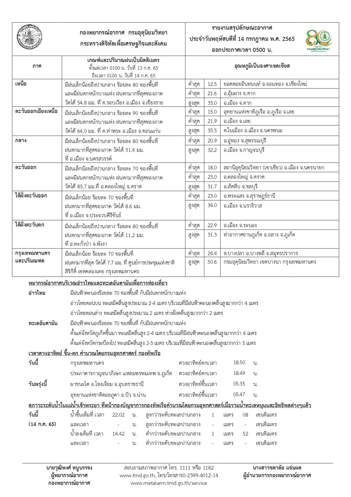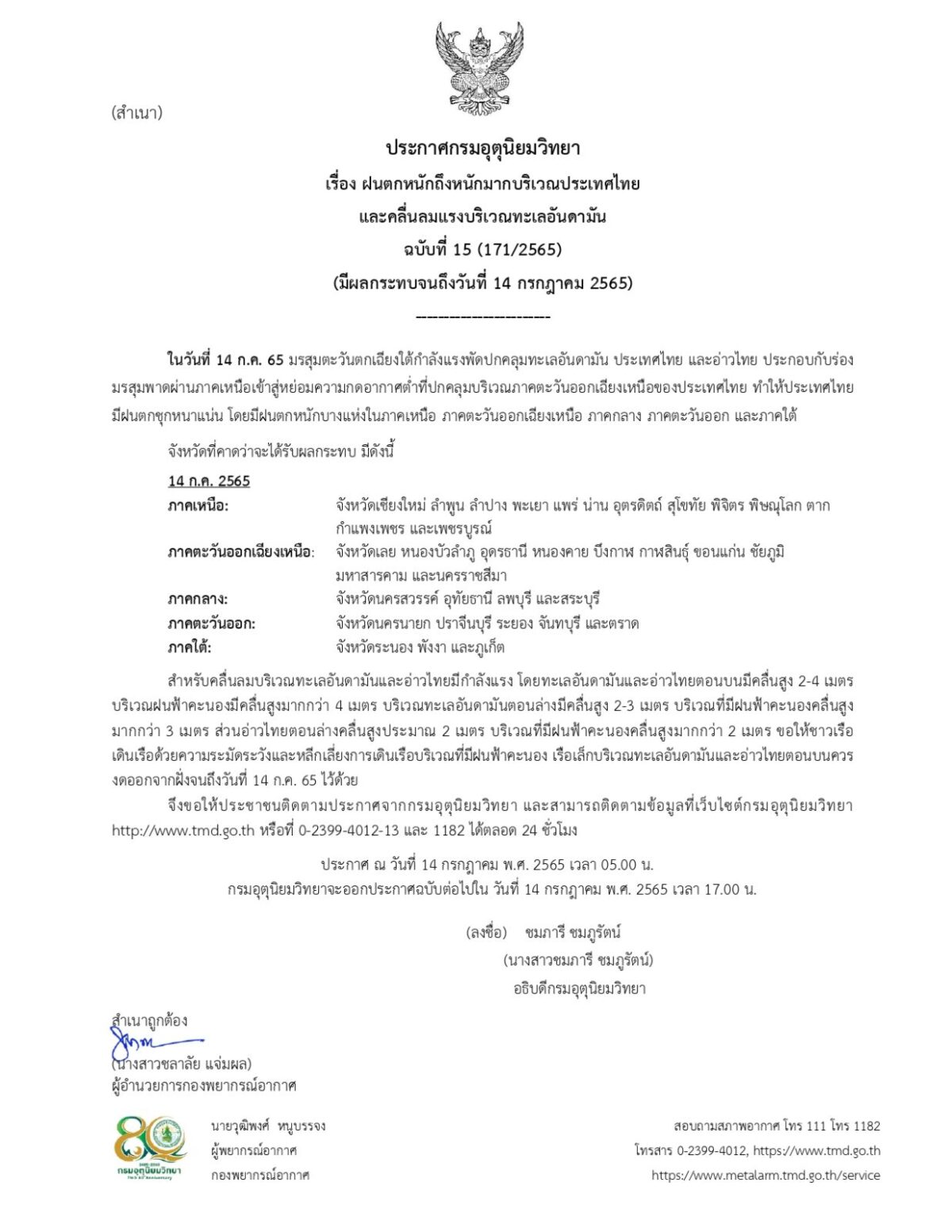 ประกาศกรมอุตุนิยมวิทยา เรื่อง ฝนตกหนักถึงหนักมากบริเวณประเทศไทย และคลื่นลมแรงบริเวณทะเลอันดามัน ฉบับที่ 15 (171/2565) มีผลกระทบจนถึงวันที่ 14 กรกฎาคม 2565