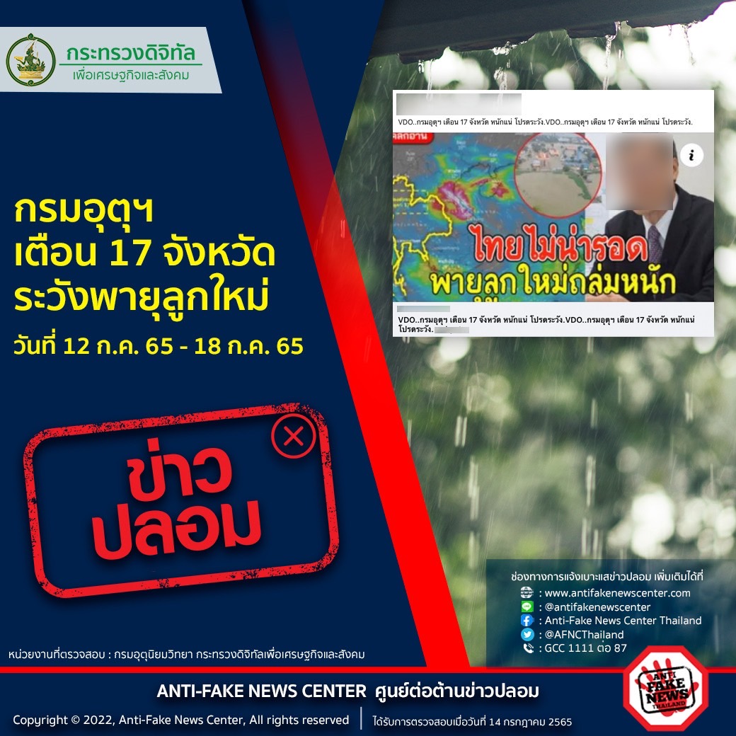 กรณีที่มีการเผยแพร่ข้อมูลในสื่อออนไลน์เกี่ยวกับเรื่องกรมอุตุฯ เตือน 17 จังหวัด ระวังพายุลูกใหม่ วันที่ 12 ก.ค. 65-18 ก.ค. 65 ทางศูนย์ต่อต้านข่าวปลอม กระทรวงดิจิทัลเพื่อเศรษฐกิจและสังคม ได้ดำเนินการตรวจสอบข้อเท็จจริงโดยกรมอุตุนิยมวิทยา กระทรวงดิจิทัลเพื่อเศรษฐกิจและสังคม พบว่าประเด็นดังกล่าวนั้น เป็นข้อมูลเท็จ