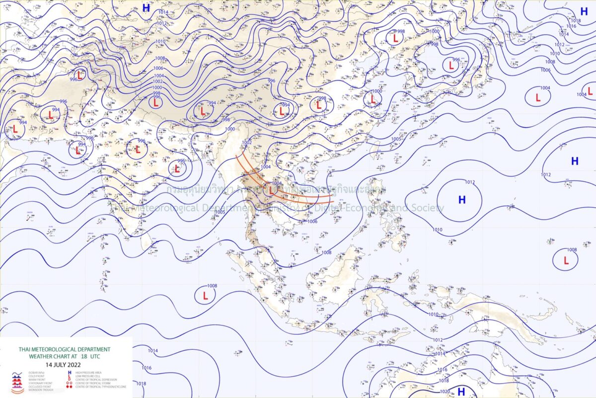 ลักษณะอากาศทั่วไป พยากรณ์อากาศ 24 ชั่วโมงข้างหน้า มรสุมตะวันตกเฉียงใต้กำลังแรง ที่พัดปกคลุมทะเลอันดามัน ประเทศไทย และอ่าวไทยมีกำลังอ่อนลง ในขณะที่ร่องมรสุมพาดผ่านภาคเหนือ เข้าสู่หย่อมความกดอากาศต่ำ ที่ปกคลุมบริเวณภาคตะวันออกเฉียงเหนือ ลักษณะเช่นนี้ทำให้ประเทศไทย ยังคงมีฝนตกหนักบางแห่ง บริเวณภาคเหนือ ภาคตะวันออกเฉียงเหนือ ภาคกลาง ภาคตะวันออก และภาคใต้ฝั่งตะวันตก ขอให้ประชาชนที่อาศัยอยู่ในบริเวณดังกล่าว โดยเฉพาะบริเวณที่ลาดเชิงเขาใกล้ทางน้ำไหลผ่านและพื้นที่ลุ่ม ระวังอันตรายจากฝนตกหนักและฝนที่ตกสะสม ซึ่งอาจทำให้เกิดน้ำท่วมฉับพลันและน้ำป่าไหลหลากในระยะนี้ไว้ด้วย