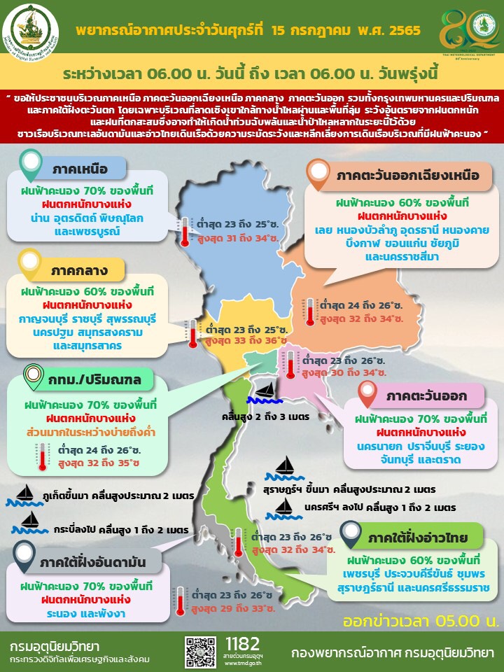 พยากรณ์อากาศ ประจำวันที่ 15 กรกฏาคม 2565 ทั่วทุกภาคประเทศไทย ยังคงมีฝนตกหนัก