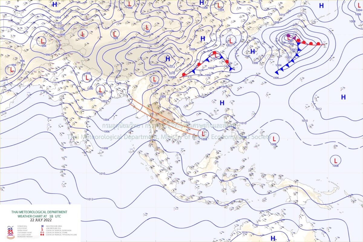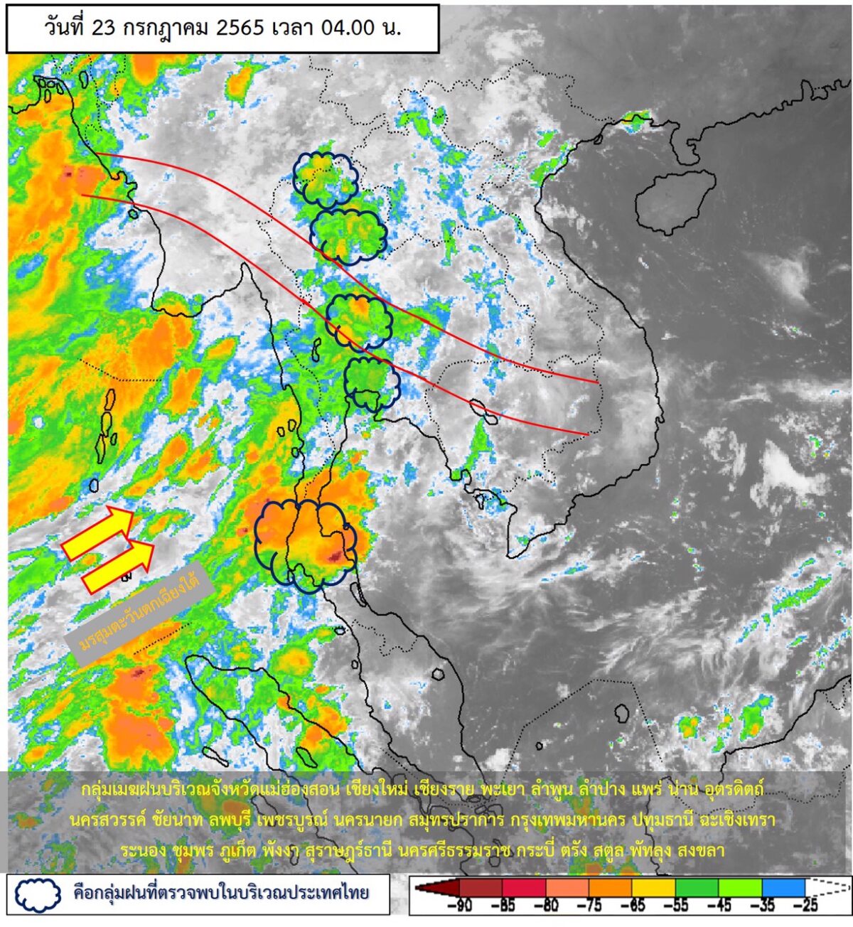 ลักษณะอากาศทั่วไป พยากรณ์อากาศ 24 ชั่วโมงข้างหน้า ร่องมรสุมพาดผ่านภาคเหนือตอนล่าง ภาคกลางตอนบน และภาคตะวันออกเฉียงเหนือตอนล่าง ประกอบกับมรสุมตะวันตกเฉียงใต้ ที่พัดปกคลุมทะเลอันดามัน ภาคใต้ และอ่าวไทยมีกำลังปานกลาง ในขณะที่มีลมใต้และลมตะวันออกเฉียงใต้ พัดปกคลุมภาคตะวันออกเฉียงเหนือตอนล่าง ลักษณะเช่นนี้ทำให้ประเทศไทยมีฝนตกหนักบางแห่ง บริเวณภาคเหนือ ภาคตะวันออกเฉียงเหนือ ภาคกลาง ภาคตะวันออก และภาคใต้ฝั่งตะวันตก ขอให้ประชาชนระวังอันตรายจากฝนตกหนักและฝนที่ตกสะสม ซึ่งอาจทำให้เกิดน้ำท่วมฉับพลันและน้ำป่าไหลหลาก โดยเฉพาะพื้นที่ลาดเชิงเขาและพื้นที่ลุ่มไว้ด้วย