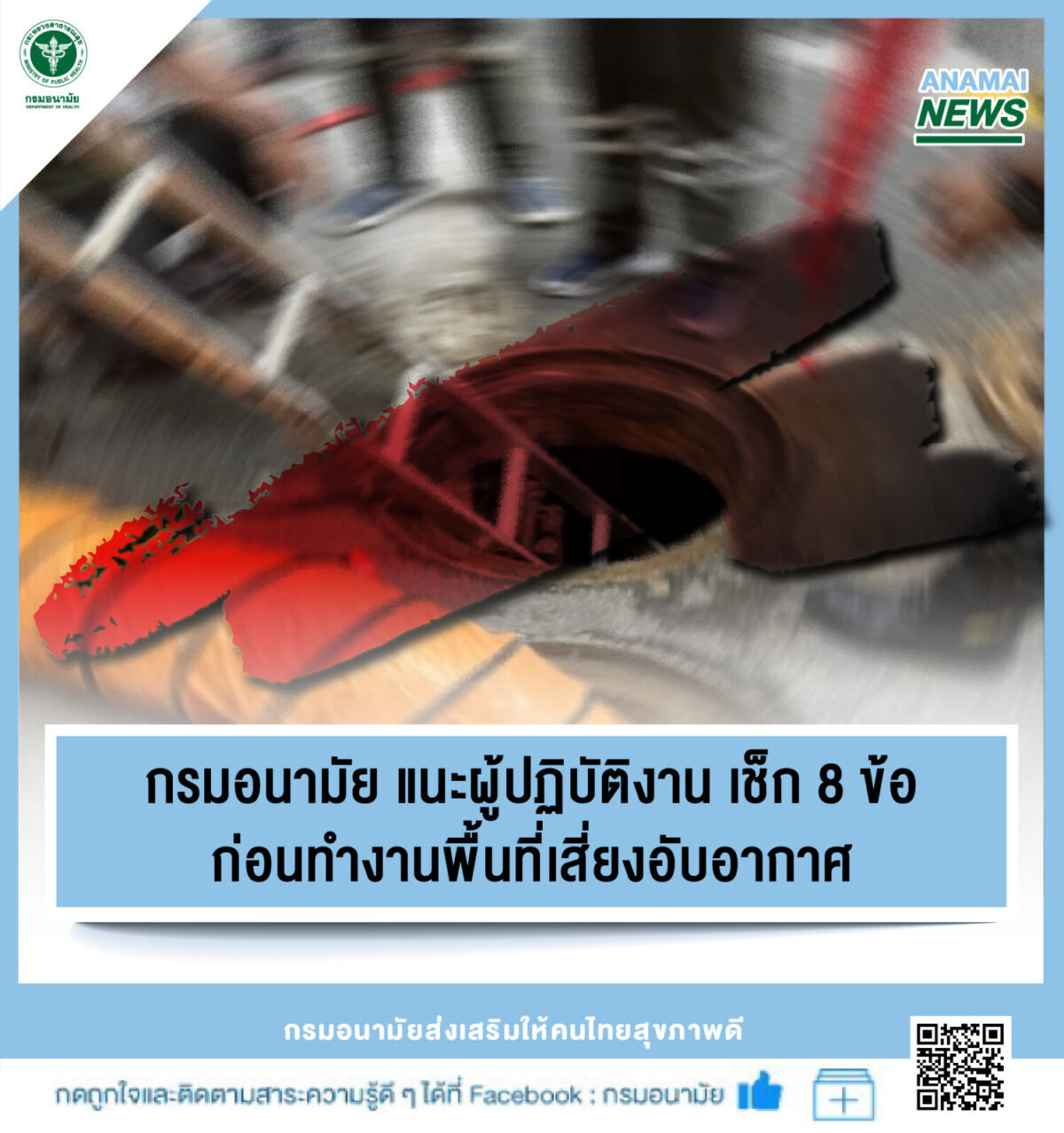 กรมอนามัย กระทรวงสาธารณสุข แนะผู้ปฏิบัติงานในพื้นที่เสี่ยงที่เป็นพื้นที่อับอากาศ ควรตรวจสอบ 8 ข้อปฏิบัติสำคัญก่อนปฏิบัติงาน เพื่อความปลอดภัย
