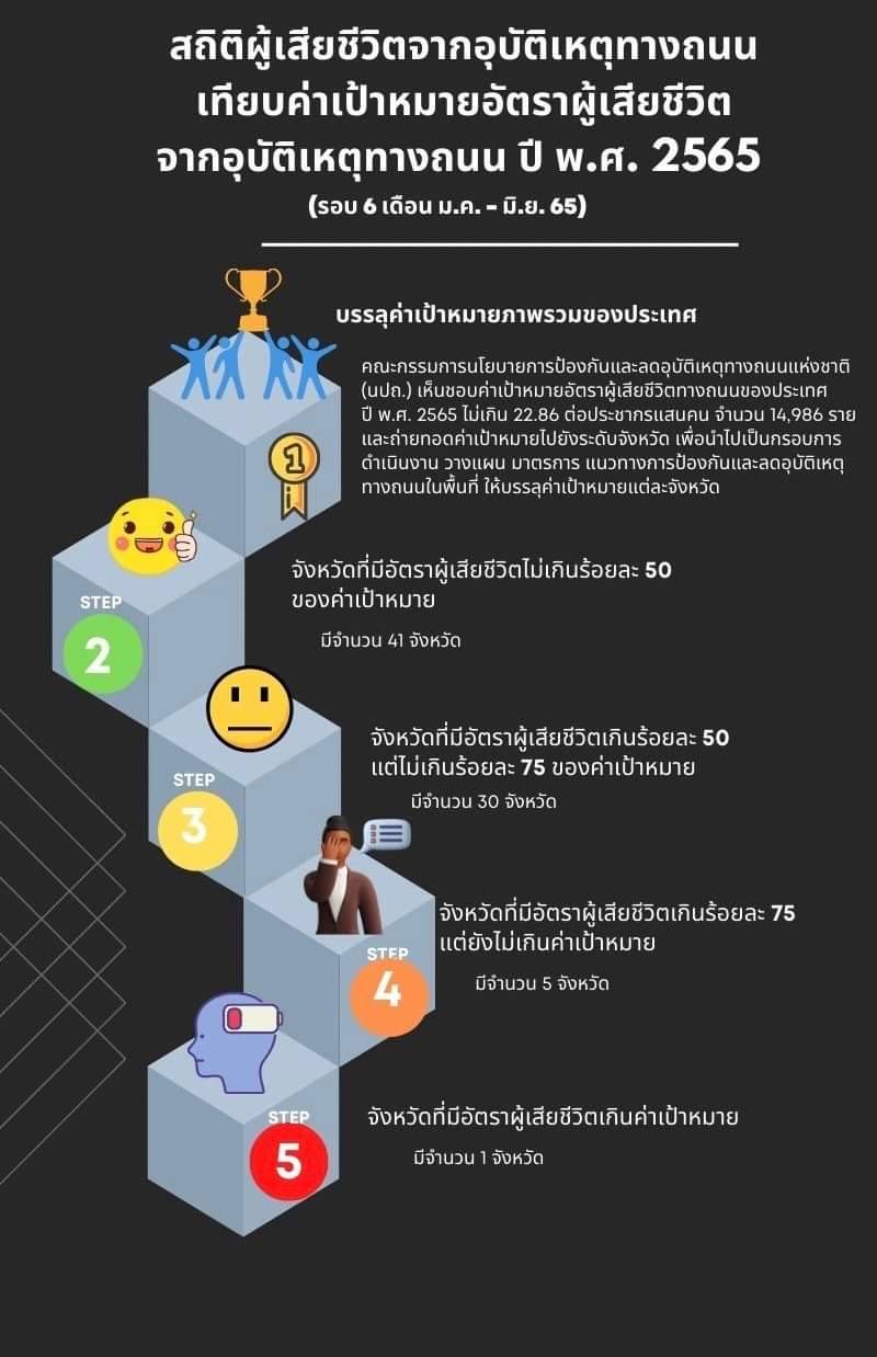 โดยกำหนดอัตราผู้เสียชีวิตต้องไม่เกิน 22.86 ต่อประชากร 1 แสนคน หรือจำนวน 14,986 ราย ซึ่งจากข้อมูลสถิติผู้เสียชีวิตจากอุบัติเหตุทางถนนของบริษัท กลางคุ้มครองผู้ประสบภัยจากรถ จำกัด ในรอบ 6 เดือน (เดือนมกราคม – มิถุนายน 2565) พบว่า ภาพรวมของประเทศมีผู้เสียชีวิตจากอุบัติเหตุทางถนน จำนวน 7,339 ราย (ข้อมูล ณ วันที่ 30 มิถุนายน 2565) คิดเป็นร้อยละ 48.97 ของค่าเป้าหมายจำนวนผู้เสียชีวิต 14,986 ราย ซึ่งสามารถจำแนกอัตราผู้เสียชีวิตในระดับจังหวัดได้ ดังนี้ 1.) อัตราผู้เสียชีวิตไม่เกินร้อยละ 50 ของค่าเป้าหมาย จำนวน 41 จังหวัด 2.) อัตราผู้เสียชีวิตเกินร้อยละ 50 แต่ไม่เกินร้อยละ 75 ของค่าเป้าหมาย จำนวน 30 จังหวัด (รวมกรุงเทพมหานคร) 3.) อัตราผู้เสียชีวิตเกินร้อยละ 75 แต่ยังไม่เกินค่าเป้าหมาย จำนวน 5 จังหวัด และ 4.) อัตราผู้เสียชีวิตเกินค่าเป้าหมาย จำนวน 1 จังหวัด