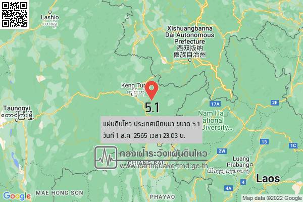 เมื่อวันที่ 2 ส.ค. 65 ผู้สื่อข่าวรายงานว่า เว็บไซต์กองเฝ้าระวังแผ่นดินไหว กรมอุตุนิยมวิทยา รายงานสถานการณ์แผ่นดินไหว เมื่อเวลา 23.03 น. วันที่ 1 ส.ค. 65 ขนาด 5.1 แมกนิจูด ในฝั่งประเทศเมียนมา ห่างจาก อ.แม่สาย ประมาณ 82 กม. สามารถรับรู้แรงสั่นสะเทือนได้ในหลายพื้นที่ของ จ.เชียงราย และ จ.เชียงใหม่