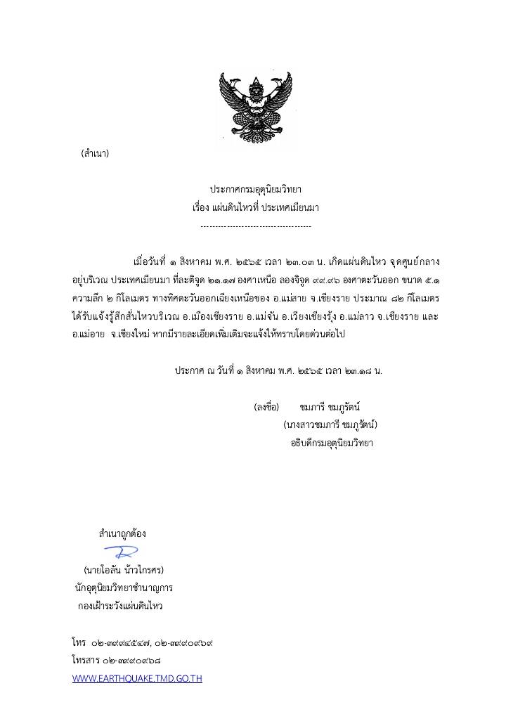 โดยเมื่อวันที่ 1 ส.ค. ที่ผ่านมา เกิดเหตุแผ่นดินไหวในประเทศเมียนมา ตั้งแต่เวลา 00.08 – 23.58 น. รวมทั้งหมด 23 ครั้ง และครั้งที่รุนแรงที่สุดเกิดขึ้นเมื่อเวลา 23.03 น. มีขนาด 5.1 แมกนิจูด ลึก 2 กม. ที่พิกัด 21.174 องศาเหนือ 99.962 องศาตะวันออก ทางทิศตะวันออกเฉียงเหนือ ของ อ.แม่สาย จ.เชียงราย ประมาณ 82 กม.