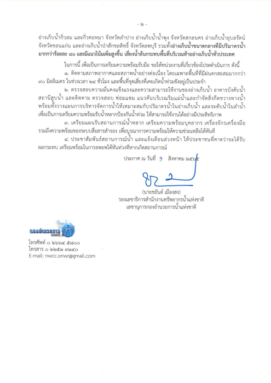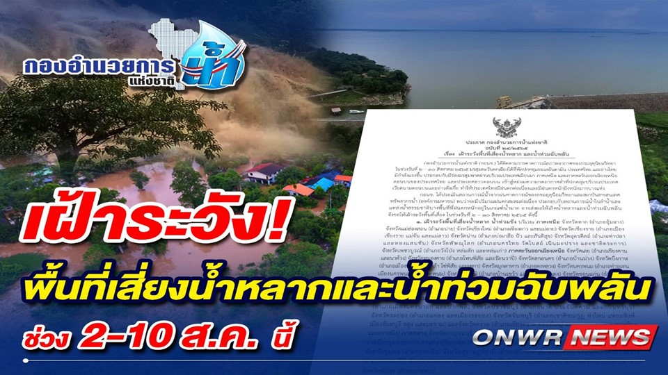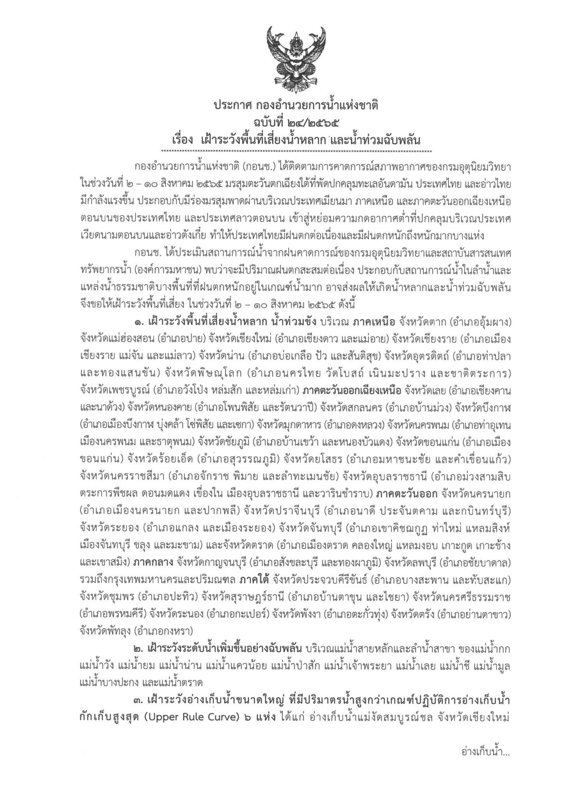 ตามที่ กองอำนวยการน้ำแห่งชาติ (กอนช.) สำนักงานทรัพยากรน้ำแห่งชาติ ได้ออกประกาศ ฉบับที่ 24/2565 เรื่อง “เฝ้าระวังพื้นที่เสี่ยงน้ำหลาก และน้ำท่วมฉับพลัน” จากการติดตามการคาดการณ์สภาพอากาศของกรมอุตุนิยมวิทยา ในช่วงวันที่ 2 – 10 สิงหาคม 2565 มรสุมตะวันตกเฉียงใต้ที่พัดปกคลุมทะเลอันดามัน ประเทศไทย และอ่าวไทยมีกำลังแรงขึ้น ประกอบกับมีร่องมรสุมพาดผ่านบริเวณประเทศเมียนมา ภาคเหนือ และภาคตะวันออกเฉียงเหนือตอนบนของประเทศไทย และประเทศลาวตอนบน เข้าสู่หย่อมความกดอากาศต่ำที่ปกคลุมบริเวณประเทศเวียดนามตอนบนและอ่าวตังเกี๋ย ทำให้ประเทศไทยมีฝนตกต่อเนื่อง และมีฝนตกหนักถึงหนักมากบางแห่ง ซึ่ง กอนช. ได้ประเมินสถานการณ์น้ำจากฝนคาดการณ์ของกรมอุตุนิยมวิทยา และสถาบันสารสนเทศทรัพยากรน้ำ (องค์การมหาชน) พบว่าจะมีปริมาณฝนตกสะสมต่อเนื่อง ประกอบกับสถานการณ์น้ำในลำน้ำและแหล่งน้ำธรรมชาติบางพื้นที่ที่ฝนตกหนักอยู่ในเกณฑ์น้ำมาก อาจส่งผลให้เกิดน้ำหลากและน้ำท่วมฉับพลัน นั้น