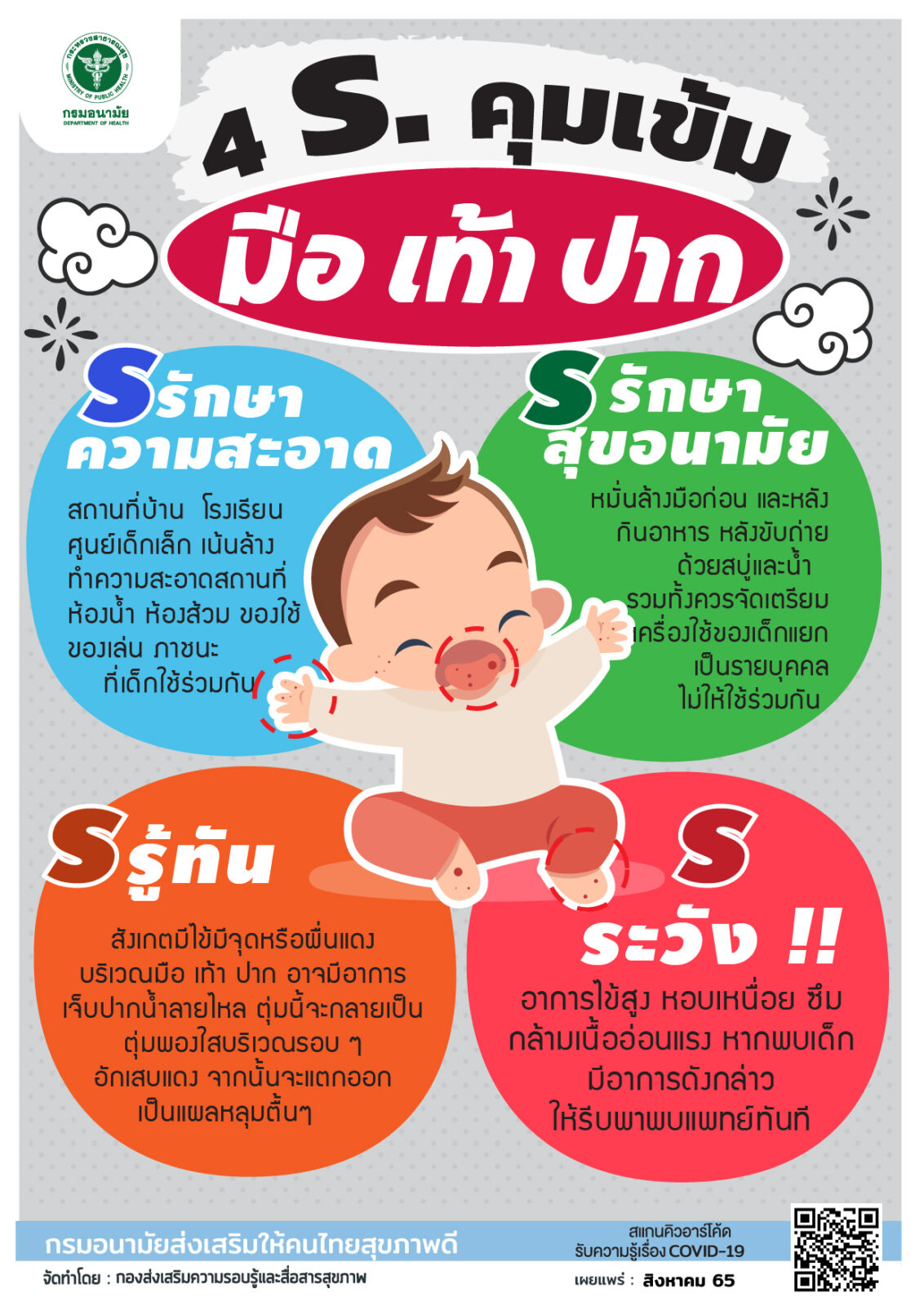 นายแพทย์สุวรรณชัย วัฒนายิ่งเจริญชัย อธิบดีกรมอนามัย กล่าวว่า ช่วงนี้หลายพื้นที่มีฝนตก อย่างต่อเนื่อง อากาศเย็นลงและค่อนข้างชื้น เอื้อต่อการเจริญเติบโตของเชื้อโรคต่างๆ โดยเฉพาะโรคมือ เท้า ปาก ประกอบกับเป็นช่วงเปิดเทอมเด็กต้องอยู่รวมกันเป็นจำนวนมาก ดังนั้น ศูนย์เด็กเล็กและโรงเรียน นับเป็นจุดเสี่ยงของการเกิดโรค จึงควรคุมเข้มในการตรวจคัดกรองเด็กก่อนเข้าเรียนทุกวัน และควรดูแลเด็กด้วยหลัก 4 ร. คือ 1) ร.รักษาความสะอาดสถานที่บ้านโรงเรียนศูนย์เด็กเล็กเน้นล้างทำความสะอาดสถานที่ ห้องน้ำ ห้องส้วม ของใช้ ของเล่น ภาชนะที่เด็กใช้ร่วมกัน โดยใช้น้ำยาทำความสะอาดที่มีส่วนผสมของคลอรีนหรือน้ำยาทำความสะอาด ที่ใช้ตามบ้านเรือน หากเป็นสิ่งของเครื่องใช้ของเด็กที่มีการนำเข้าปากให้ล้างด้วยสบู่และล้างออกด้วยน้ำสะอาดแล้วนำไปตากแดด หรือเช็ดให้แห้ง หากมีเด็กป่วยเพิ่มขึ้นให้ปิดห้องเรียนหรือโรงเรียน และจัดการทำความสะอาด เพื่อป้องกันการแพร่ระบาด