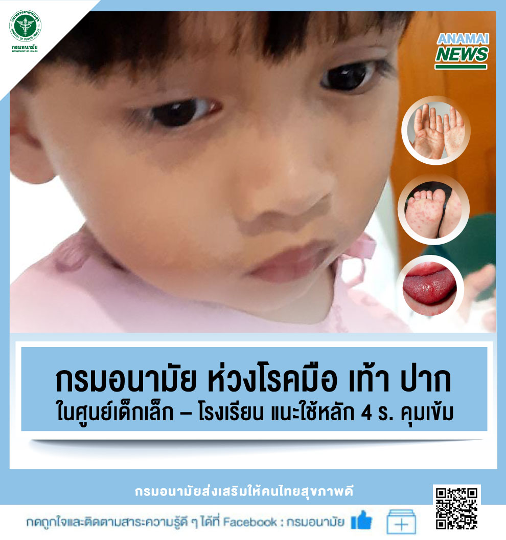 “ข้อถัดมาคือ 2) ร.รักษาสุขอนามัยหมั่นล้างมือก่อนและหลังกินอาหาร หลังขับถ่าย ด้วยสบู่และน้ำ รวมทั้งควรจัดเตรียมเครื่องใช้ของเด็กแยกเป็นรายบุคคล ไม่ให้ใช้ร่วมกัน ส่วนผู้ดูแลเด็กต้องทำความสะอาดมือก่อนหยิบจับอาหารให้เด็กกิน และอาหารต้องไม่มีแมลงวันตอม น้ำดื่มต้องสะอาด ผ้าอ้อมหรือเสื้อผ้า ที่เปื้อนอุจจาระต้องรีบซักให้สะอาดโดยเร็ว และทิ้งน้ำลงในโถส้วม ห้ามทิ้งลงท่อระบายน้ำ 3) ร.รู้ทันสังเกตมีไข้ มีจุดหรือผื่นแดงบริเวณมือ เท้า ปาก อาจมีอาการเจ็บปากน้ำลายไหล ตุ่มนี้จะกลายเป็นตุ่มพองใสบริเวณรอบๆ อักเสบแดง จากนั้นจะแตกออกเป็นแผลหลุมตื้น ๆ อาการจะทุเลาและหายเป็นปกติภายใน 7-10 วัน และ 4) ร.ระวังไข้สูง หอบเหนื่อย ซึม กล้ามเนื้ออ่อนแรง หากพบเด็กมีอาการดังกล่าว ให้รีบพาพบแพทย์ทันที” อธิบดีกรมอนามัย กล่าว