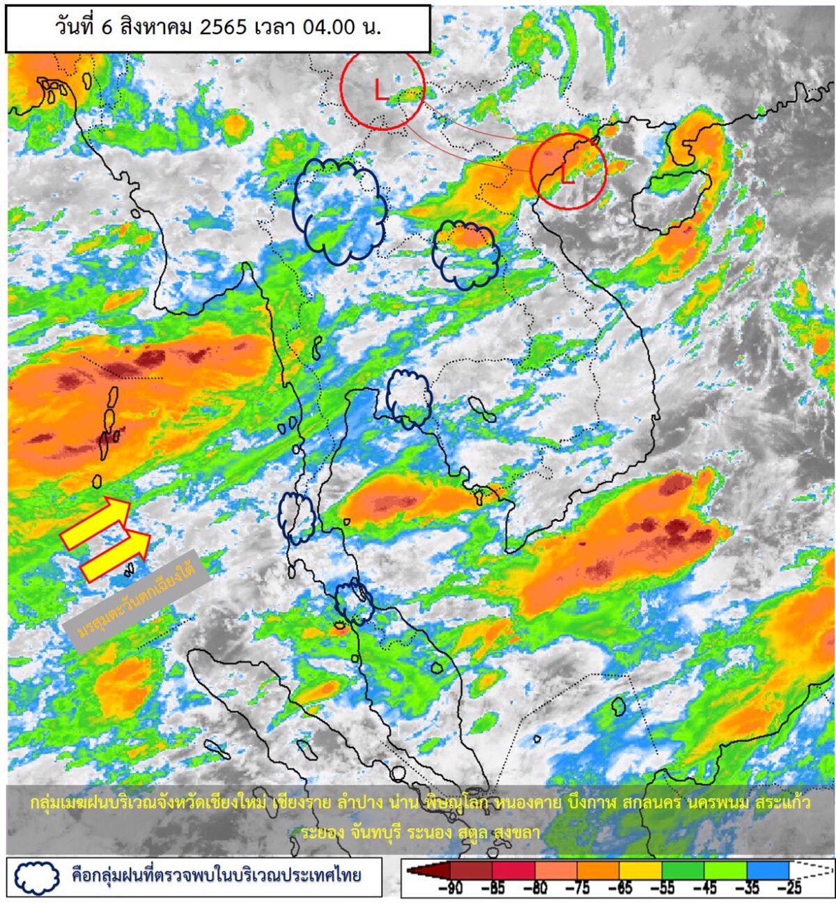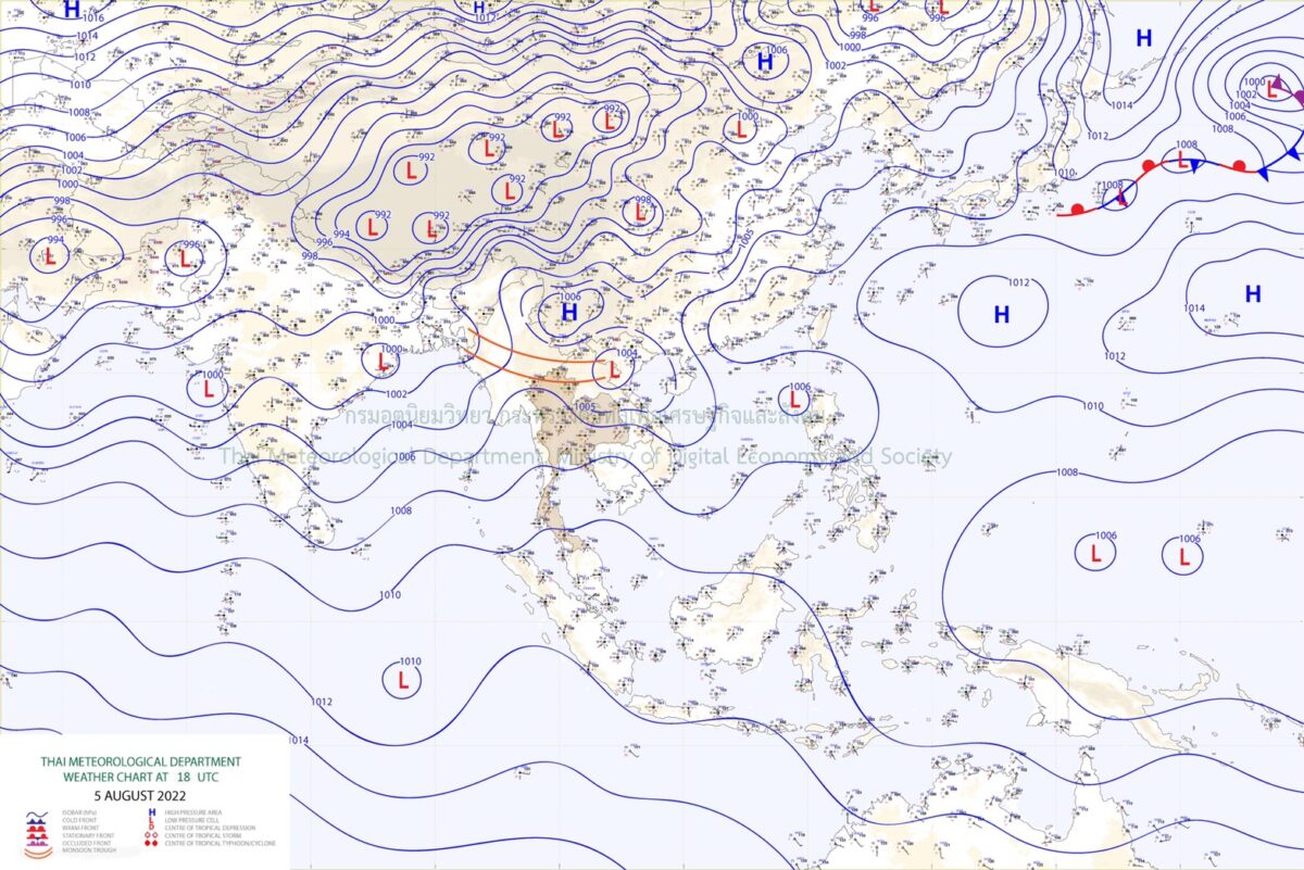 อนึ่ง ในช่วงวันที่ 7 – 9 ส.ค. 65 ร่องมรสุมจะเลื่อนลงมาพาดผ่านบริเวณภาคเหนือตอนบน และภาคตะวันออกเฉียงเหนือตอนบน เข้าสู่หย่อมความกดอากาศต่ำ บริเวณประเทศเวียดนามตอนบน ประกอบกับมรสุมตะวันตกเฉียงใต้ ที่พัดปกคลุมทะเลอันดามัน ประเทศไทย และอ่าวไทยจะมีกำลังแรงขึ้น ทำให้ประเทศไทยมีฝนเพิ่มขึ้น และมีฝนตกหนักถึงหนักมากบางแห่ง