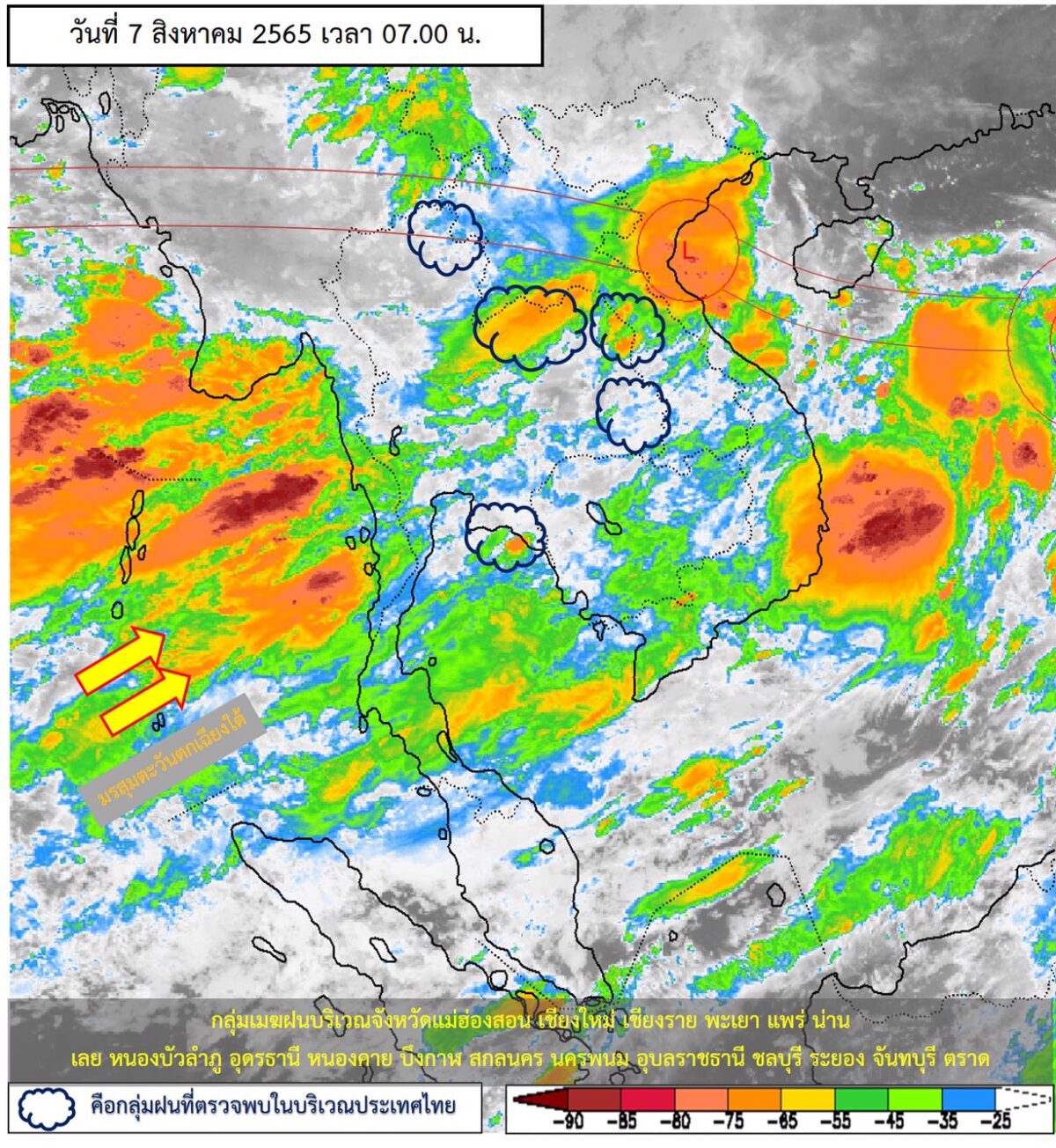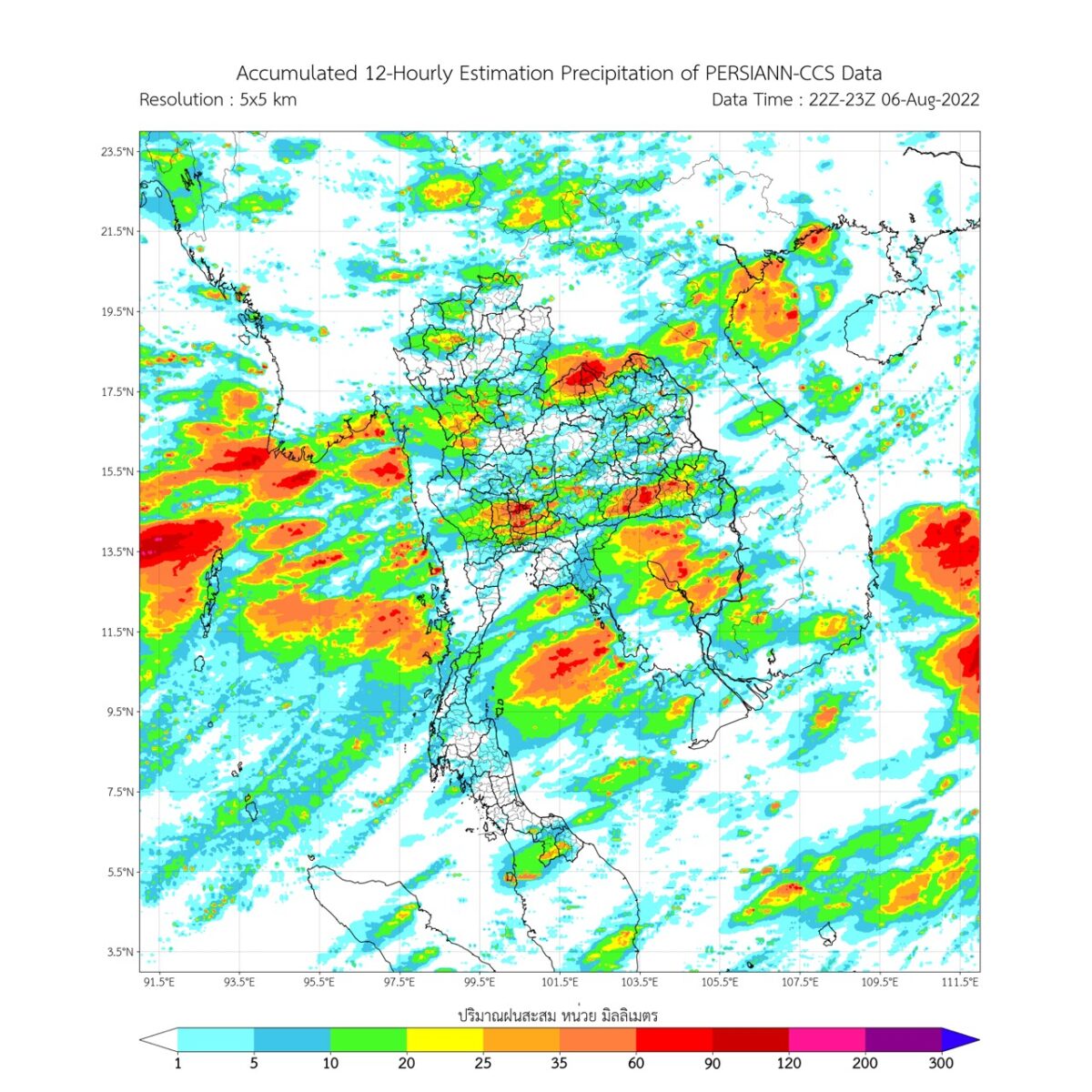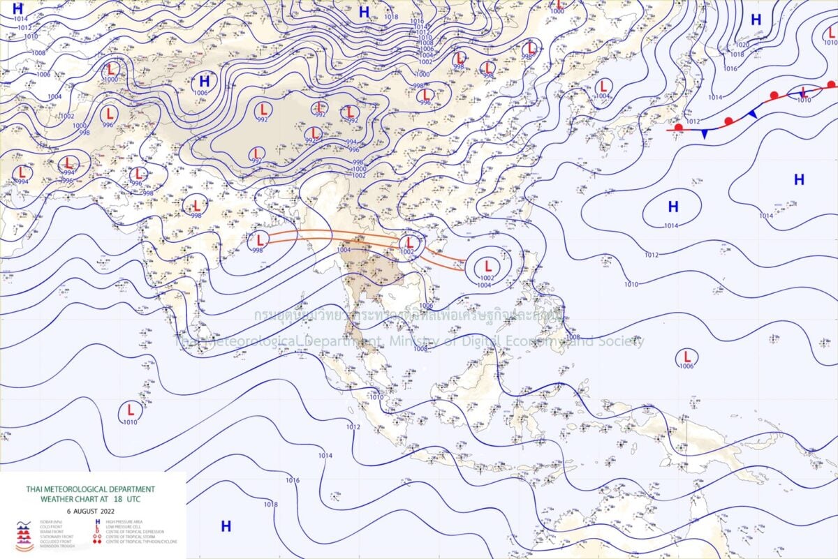 ลักษณะอากาศทั่วไป พยากรณ์อากาศ 24 ชั่วโมงข้างหน้า ประเทศไทยมีฝนเพิ่มขึ้น โดยมีฝนตกหนักถึงหนักมากบางแห่งบริเวณภาคเหนือ ภาคตะวันออกเฉียงเหนือ ภาคกลางรวมทั้งกรุงเทพมหานครและปริมณฑล ภาคตะวันออก และภาคใต้ฝั่งตะวันตก ขอให้ประชาชนในบริเวณดังกล่าวระวังอันตรายจากฝนตกหนักถึงหนักมากและฝนที่ตกสะสม ซึ่งอาจทำให้เกิดน้ำท่วมฉับพลันและน้ำป่าไหลหลาก โดยเฉพาะพื้นที่ลาดเชิงเขาใกล้ทางน้ำไหลผ่านและพื้นที่ลุ่มในระยะนี้ไว้ด้วย สำหรับคลื่นลมบริเวณทะเลอันดามันและอ่าวไทยมีกำลังแรงขึ้น โดยทะเลอันดามันตอนบนมีคลื่นสูง 2-3 เมตร บริเวณที่มีฝนฟ้าคะนองคลื่นสูงมากกว่า 3 เมตร ส่วนบริเวณอ่าวไทยตอนบนห่างฝั่งมีคลื่นสูงประมาณ 2 เมตร บริเวณที่มีฝนฟ้าคะนองคลื่นสูงมากกว่า 2 เมตร ขอให้ชาวเรือในบริเวณดังกล่าวเดินเรือด้วยความระมัดระวังและหลีกเลี่ยงการเดินเรือบริเวณที่มีฝนฟ้าคะนอง สำหรับเรือเล็กบริเวณทะเลอันดามันควรงดออกจากฝั่งจนถึงวันที่ 9 ส.ค. 65