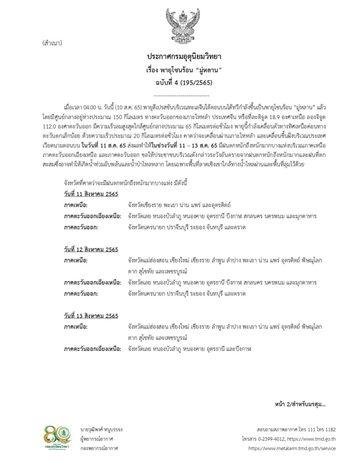 ประกาศกรมอุตุนิยมวิทยา เรื่อง พายุโซนร้อน “มู่หลาน” ฉบับที่ 4 (195/2565)