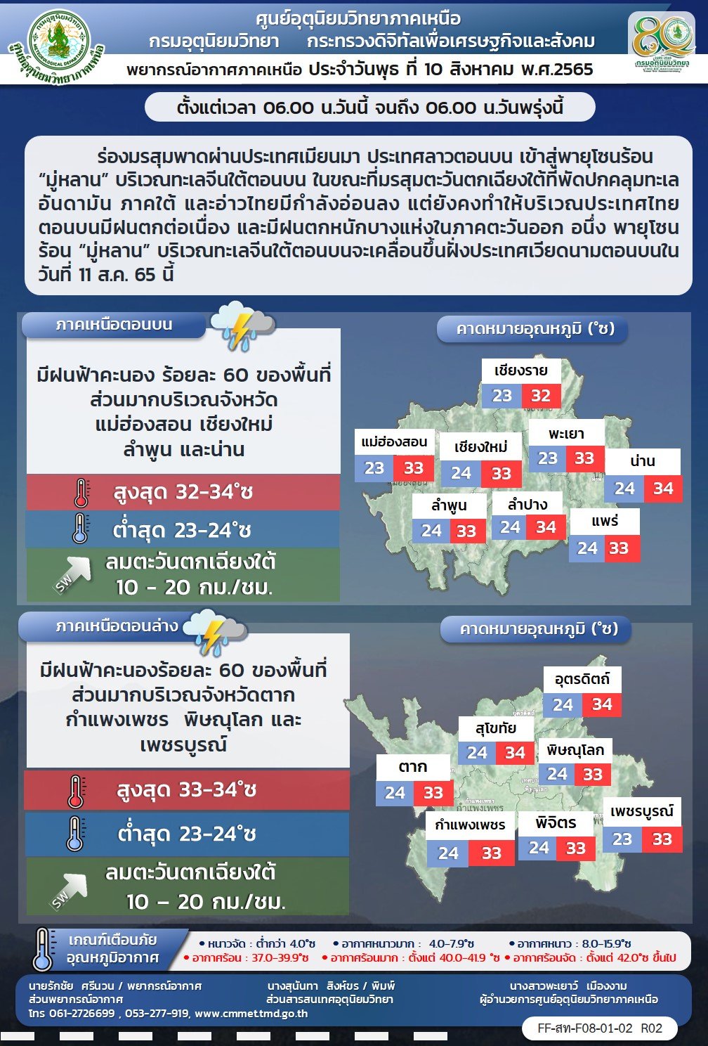 เมื่อเวลา 04.00 น. วันนี้ (10 ส.ค. 65) พายุดีเปรสชันบริเวณทะเลจีนใต้ตอนบน ได้ทวีกำลังขึ้นเป็นพายุโซนร้อน “มู่หลาน” แล้ว โดยมีศูนย์กลางอยู่ห่างประมาณ 150 กิโลเมตร ทางตะวันออกของเกาะไหหลำ ประเทศจีน หรือที่ละติจูด 18.9 องศาเหนือ ลองจิจูด1 12.0 องศาตะวันออก มีความเร็วลมสูงสุดใกล้ศูนย์กลางประมาณ 65 กิโลเมตรต่อชั่วโมง พายุนี้กำลังเคลื่อนตัวทางทิศเหนือค่อนทางตะวันตกเล็กน้อย ด้วยความเร็วประมาณ 20 กิโลเมตรต่อชั่วโมง คาดว่าจะเคลื่อนผ่านเกาะไหหลำ และเคลื่อนขึ้นฝั่งบริเวณประเทศเวียดนามตอนบน ในวันที่ 11 ส.ค. 65 ส่งผลทำให้ในช่วงวันที่ 11 – 13 ส.ค. 65 มีฝนตกหนักถึงหนักมากบางแห่ง บริเวณภาคเหนือ ภาคตะวันออกเฉียงเหนือ และภาคตะวันออก ขอให้ประชาชนบริเวณดังกล่าว ระวังอันตรายจากฝนตกหนักถึงหนักมาก และฝนที่ตกสะสม ซึ่งอาจทำให้เกิดน้ำท่วมฉับพลันและน้ำป่าไหลหลาก โดยเฉพาะพื้นที่ลาดเชิงเขาใกล้ทางน้ำไหลผ่านและพื้นที่ลุ่มไว้ด้วย