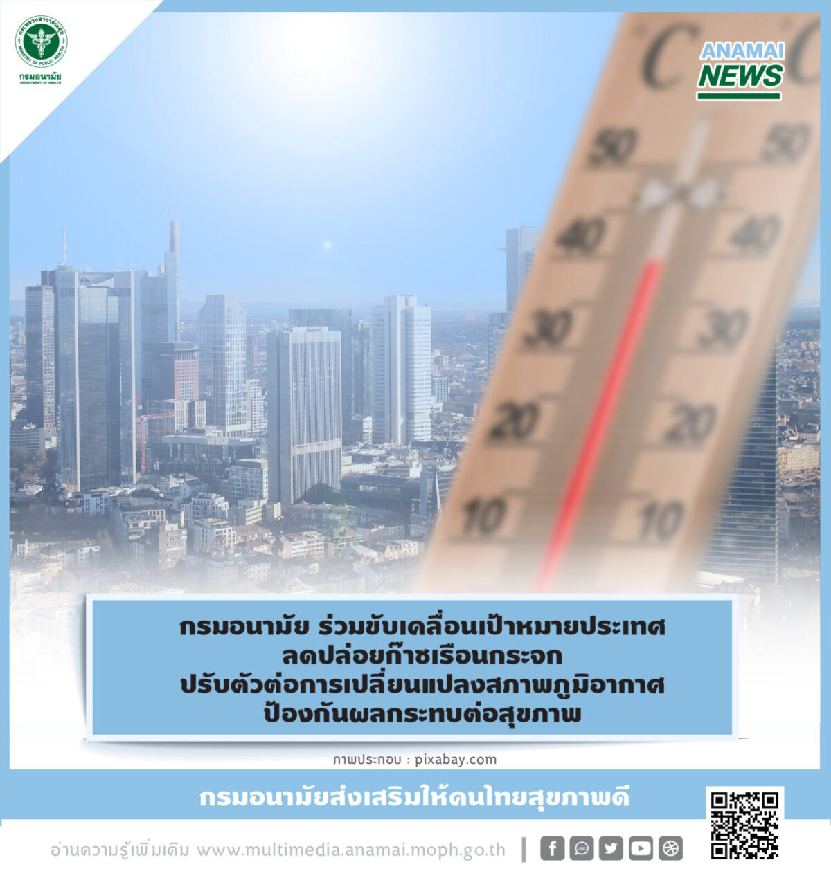 “ทั้งนี้ กรมอนามัยได้ดำเนินการเกี่ยวกับการเปลี่ยนแปลงสภาพภูมิอากาศใน 2 ส่วน ได้แก่ 1.) การลดก๊าซเรือนกระจก (Mitigation) ในสถานบริการสาธารณสุข เพื่อเป็นต้นแบบในการลดโลกร้อน และสร้างความรู้ความเข้าใจให้กับบุคลากรสาธารณสุขเกี่ยวกับผลกระทบต่อสุขภาพจากการเปลี่ยนแปลงสภาพภูมิอากาศ และ 2.) การปรับตัว (Adaptation) โดยพัฒนาองค์ความรู้ ได้แก่ การดำเนินโครงการศึกษาผลกระทบต่อสุขภาพจากการเปลี่ยนแปลงสภาพภูมิอากาศ การจัดทำแผนที่เสี่ยงต่อการเกิดโรคจากการเปลี่ยนแปลงสภาพภูมิอากาศในประเทศไทย เพื่อใช้เป็นข้อมูลพื้นฐานประกอบการตัดสินใจเชิงนโยบายในการป้องกันและควบคุมโรคที่เกี่ยวข้องกับการเปลี่ยนแปลงสภาพภูมิอากาศ