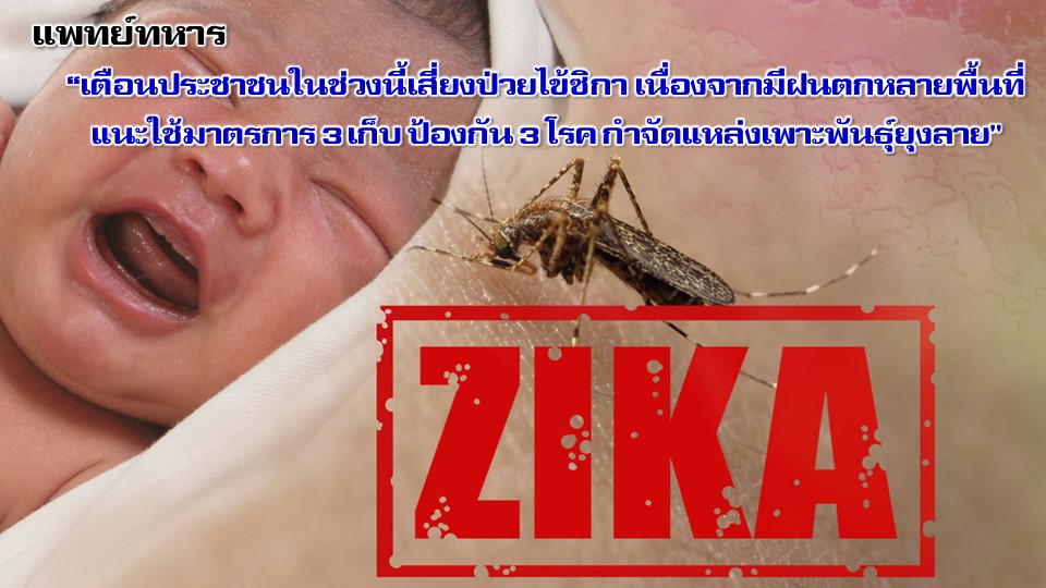 แพทย์ทหาร “เตือนประชาชนในช่วงนี้เสี่ยงป่วยไข้ซิกา เนื่องจากมีฝนตกหลายพื้นที่ แนะใช้มาตรการ 3 เก็บ ป้องกัน 3 โรค กำจัดแหล่งเพาะพันธุ์ยุงลาย”