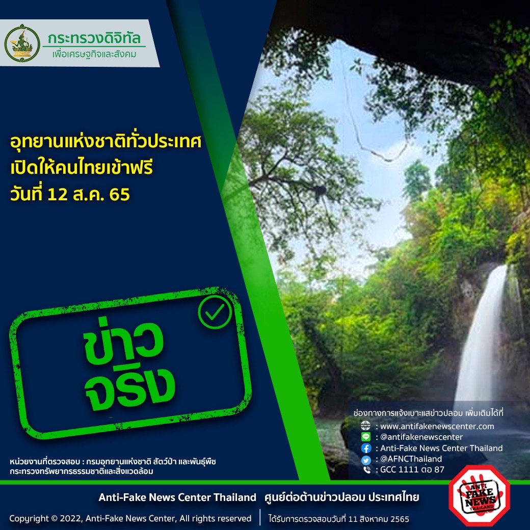 กรณีที่มีข้อมูลในสื่อต่างๆ เกี่ยวกับประเด็นเรื่องอุทยานแห่งชาติทั่วประเทศ เปิดให้คนไทยเข้าฟรี วันที่ 12 ส.ค. 65 ทางศูนย์ต่อต้านข่าวปลอม กระทรวงดิจิทัลเพื่อเศรษฐกิจและสังคม ได้ดำเนินการตรวจสอบข้อเท็จจริงโดยกรมอุทยานแห่งชาติ สัตว์ป่า และพันธุ์พืช กระทรวงทรัพยากรธรรมชาติและสิ่งแวดล้อม พบว่าประเด็นดังกล่าวนั้น เป็นข้อมูลจริง