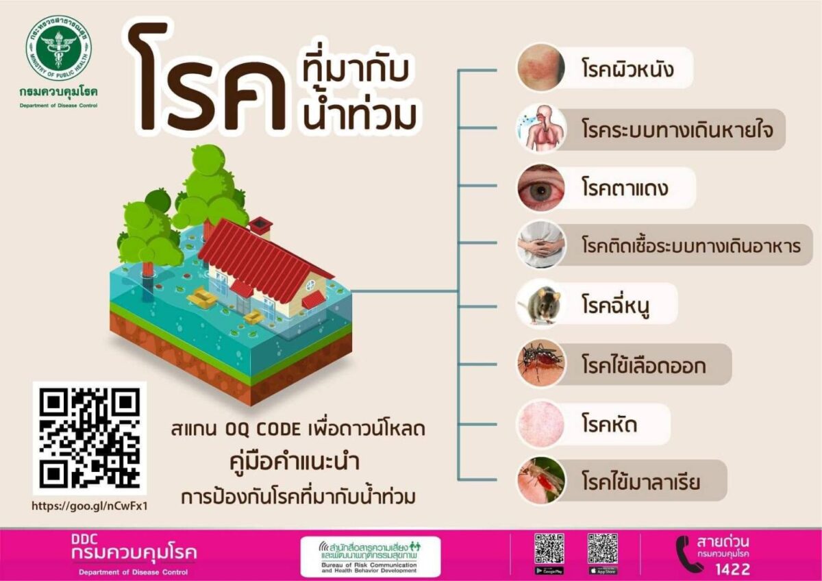 กรมควบคุมโรค เตือนประชาชนเตรียมความพร้อมรับมือพายุ “มู่หลาน” แนะ 6 วิธีเตรียมพร้อมก่อนน้ำท่วม อาทิ เตรียมน้ำ อาหารแห้ง ยาสามัญประจำบ้าน ยาโรคประจำตัว สามารถยังชีพได้อย่างน้อย 3-5 วัน พร้อมจดเบอร์โทรหมายเลข 1669 กรณีเจ็บป่วยฉุกเฉิน, หมายเลข 1784 ด้านสาธารณภัย และ 1422 สายด่วนกรมควบคุมโรคปรึกษากรณีเจ็บป่วย เพื่อความปลอดภัยของชีวิต และลดการสูญเสีย