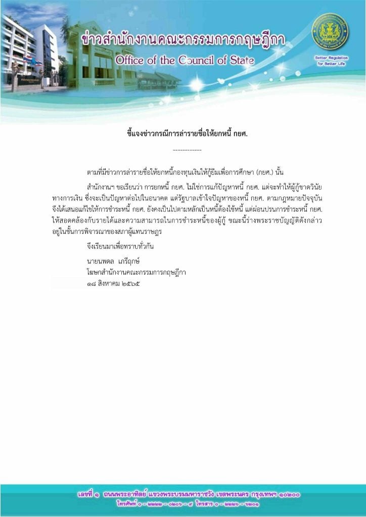 สำนักงานฯ ขอเรียนว่า การยกหนี้ กยศ. ไม่ใช่การแก้ปัญหาหนี้ กยศ. แต่จะทำให้ผู้กู้ขาดวินัยทางการเงิน ซึ่งจะเป็นปัญหาต่อไปในอนาคต แต่รัฐบาลเข้าใจปัญหาของหนี้ กยศ. ตามกฎหมายปัจจุบัน จึงเสนอแก้ไขให้การชำระหนี้ กยศ. ยังคงเป็นไปตามหลักเป็นหนี้ต้องใช้หนี้ แต่ผ่อนปรนการชำระหนี้ กยศ. ให้สอดคล้องกับรายได้และความสามารถในการชำระหนี้ของผู้กู้ ขณะนี้ร่างพระราชบัญญัติดังกล่าวอยู่ในชั้นการพิจารณาของสภาผู้แทนราษฎร