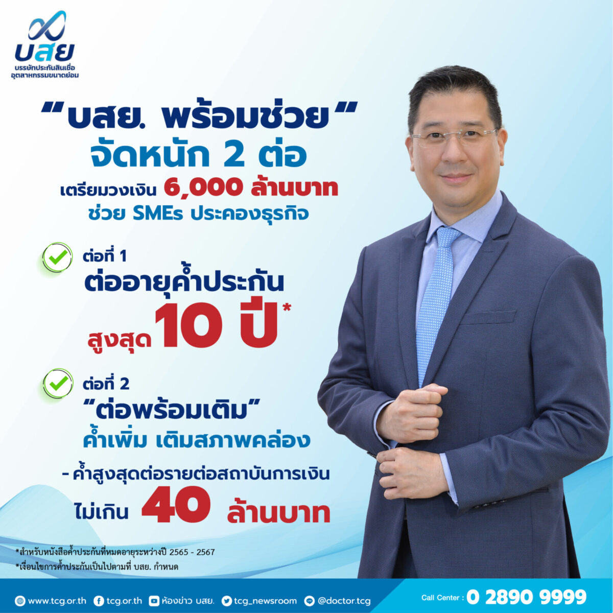 บสย. กดปุ่มมาตรการใหม่ ช่วย 2 เด้ง ชุบชีวิต SMEs แก้หนี้ยั่งยืนประคอบธุรกิจ SMEs ต่ออายุค้ำ 10 ปี “ต่อพร้อมเติม ค้ำเพิ่ม…เติมสภาพคล่อง วงเงิน 6,000 ล้านบาท