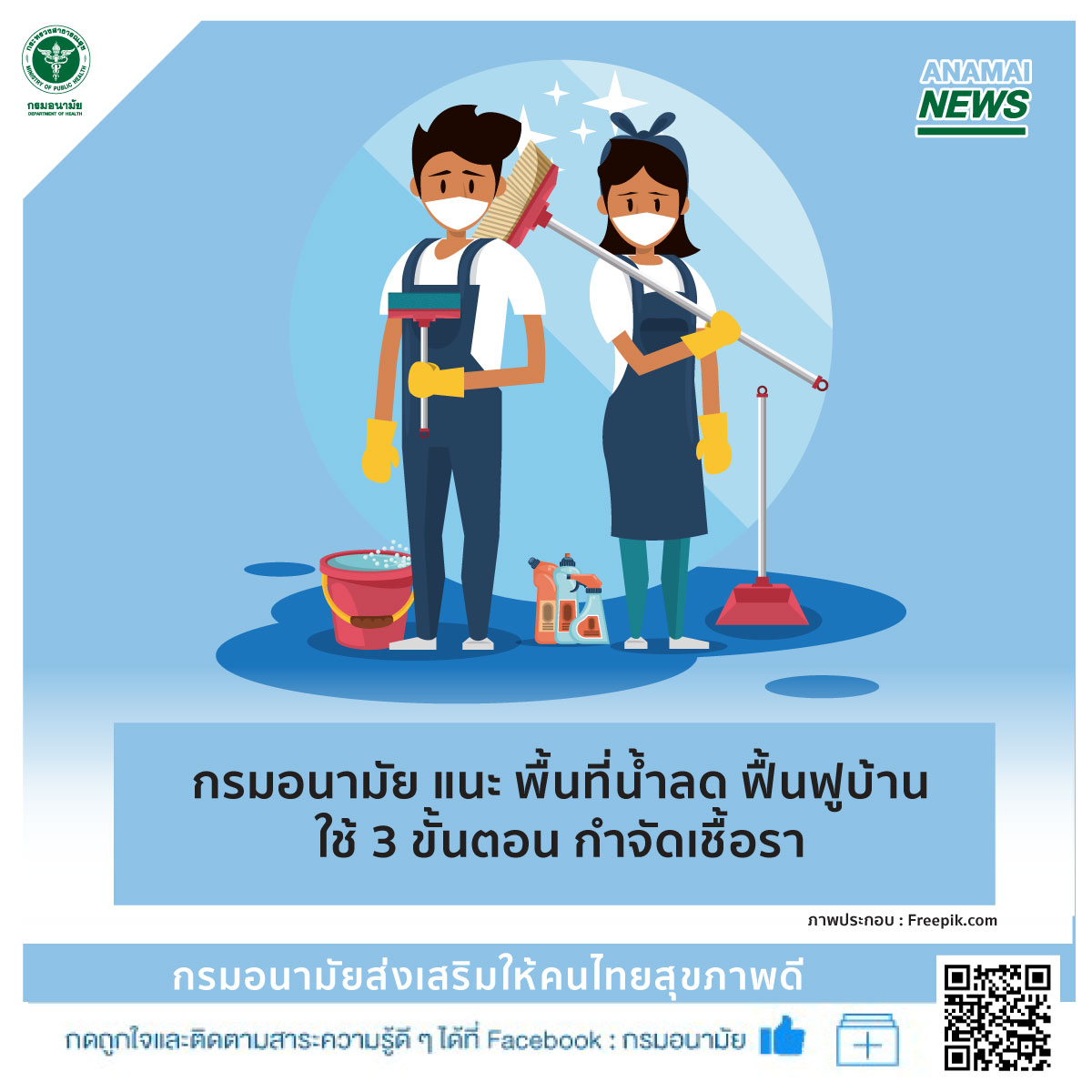 กรมอนามัย กระทรวงสาธารณสุข แนะทำความสะอาดบ้าน กำจัดเชื้อรา 3 ขั้นตอน หลังน้ำลด ฟื้นฟูสภาพแวดล้อมและที่พักอาศัยด้วยการรื้อและล้างให้สะอาด ปลอดภัยตามหลักสุขาภิบาล