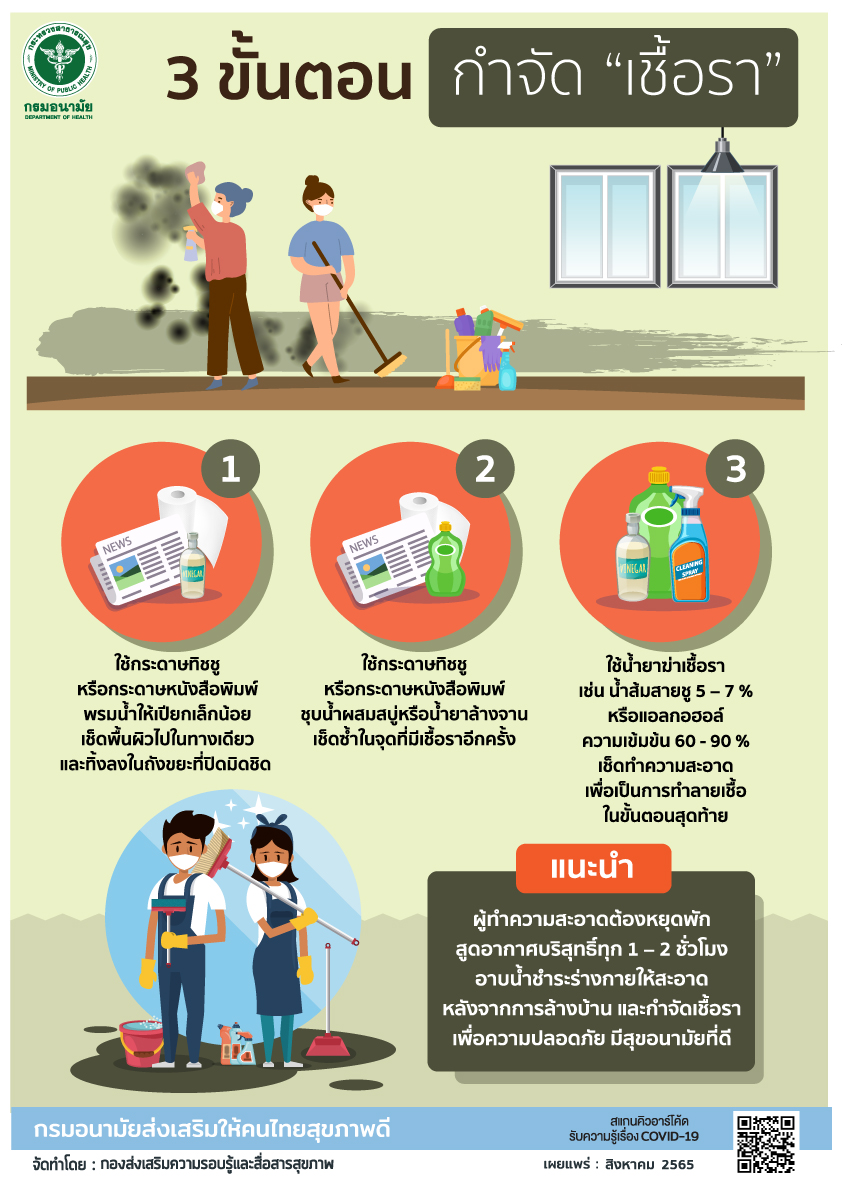 เช็ดทำความสะอาด เพื่อเป็นการทำลายเชื้อในขั้นตอนสุดท้าย โดยผู้ทำความสะอาดต้องหยุดพักสูดอากาศบริสุทธิ์ ทุก 1-2 ชั่วโมง อาบน้ำชำระร่างกายให้สะอาดหลังจากการล้างบ้านและกำจัดเชื้อรา เพื่อความปลอดภัย และสุขอนามัยดี” อธิบดีกรมอนามัย กล่าวในที่สุด