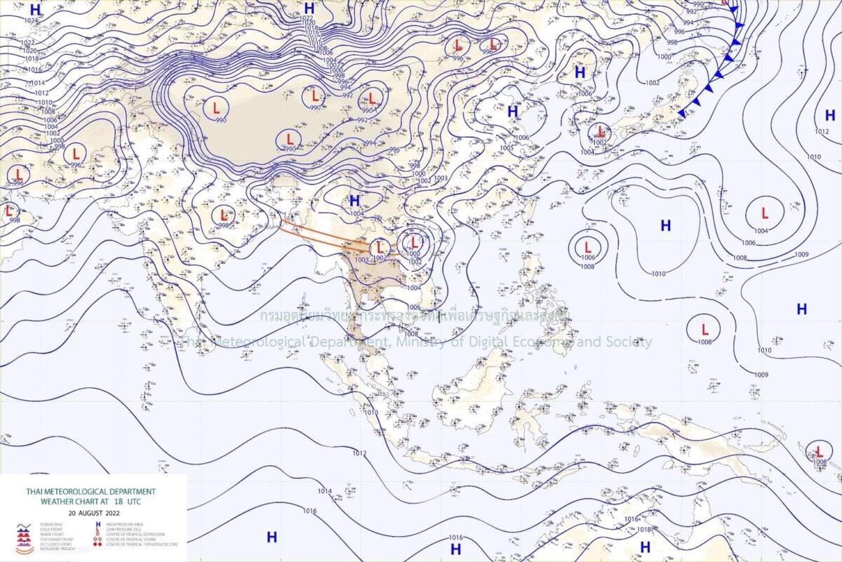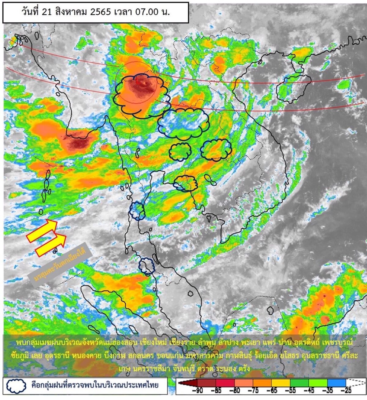 ลักษณะอากาศทั่วไป พยากรณ์อากาศ 24 ชั่วโมงข้างหน้า ร่องมรสุมกำลังแรงพาดผ่านประเทศเมียนมา ภาคเหนือตอนบน และภาคตะวันออกเฉียงเหนือตอนบนของประเทศไทย เข้าสู่หย่อมความกดอากาศต่ำกำลังแรงบริเวณชายฝั่งประเทศเวียดนามตอนบนและอ่าวตังเกี๋ย ประกอบกับมรสุมตะวันตกเฉียงใต้ที่พัดปกคลุมทะเลอันดามัน ประเทศไทย และอ่าวไทย มีกำลังปานกลาง ลักษณะเช่นนี้ทำให้ประเทศไทยมีฝนเพิ่มขึ้น โดยมีฝนตกหนักหลายพื้นที่และมีฝนตกหนักมากบางแห่งบริเวณภาคเหนือ ภาคตะวันออกเฉียงเหนือ ภาคกลาง รวมทั้งกรุงเทพมหานครและปริมณฑล ภาคตะวันออก และภาคใต้ ขอให้ประชาชนในบริเวณดังกล่าวระวังอันตรายจากฝนตกหนักถึงหนักมากและฝนที่ตกสะสม ซึ่งอาจทำให้เกิดน้ำท่วมฉับพลันและน้ำป่าไหลหลาก โดยเฉพาะพื้นที่ลาดเชิงเขาใกล้ทางน้ำไหลผ่านและพื้นที่ลุ่มไว้ด้วย