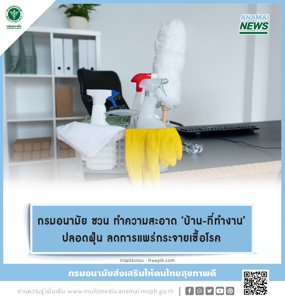 กรมอนามัย กระทรวงสาธารณสุข ชวนประชาชนทำความสะอาดบ้าน และสถานที่ทำงาน ให้ปลอดจากฝุ่น เพื่อเป็นการลดการแพร่กระจายของเชื้อโรค