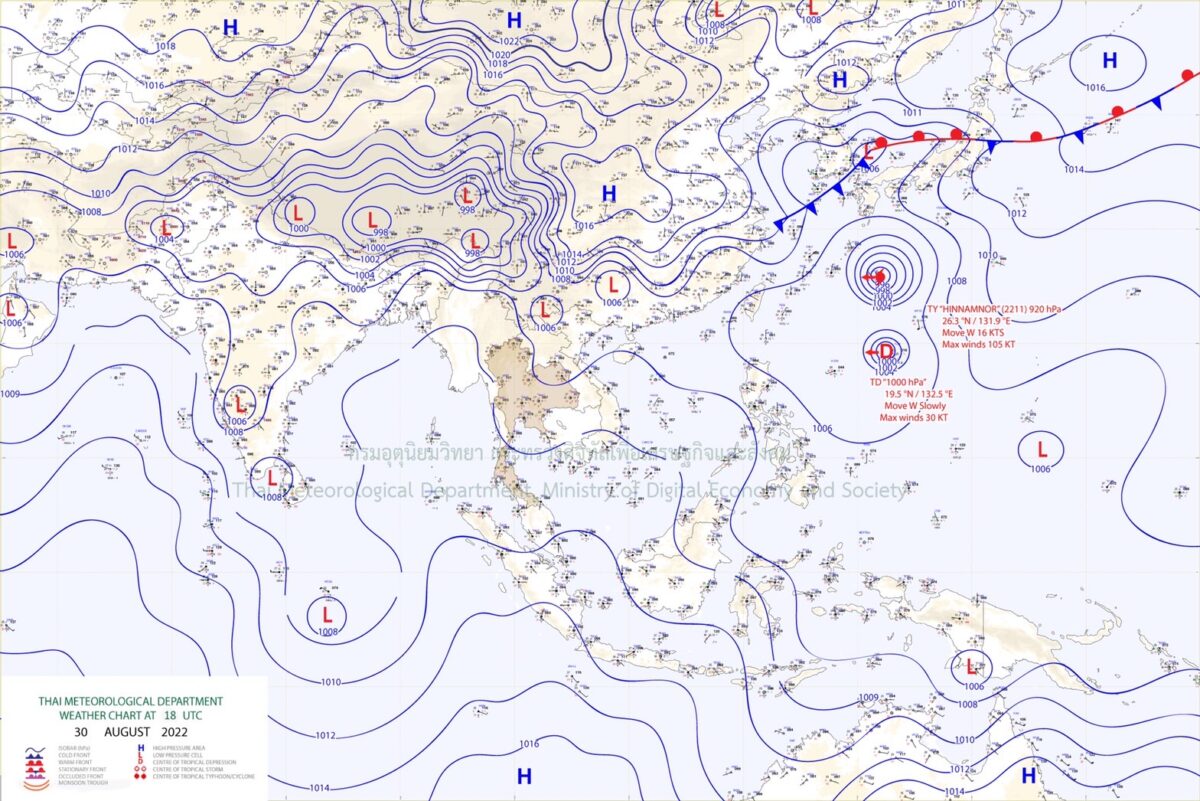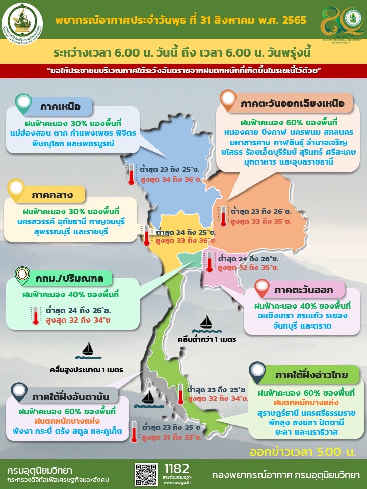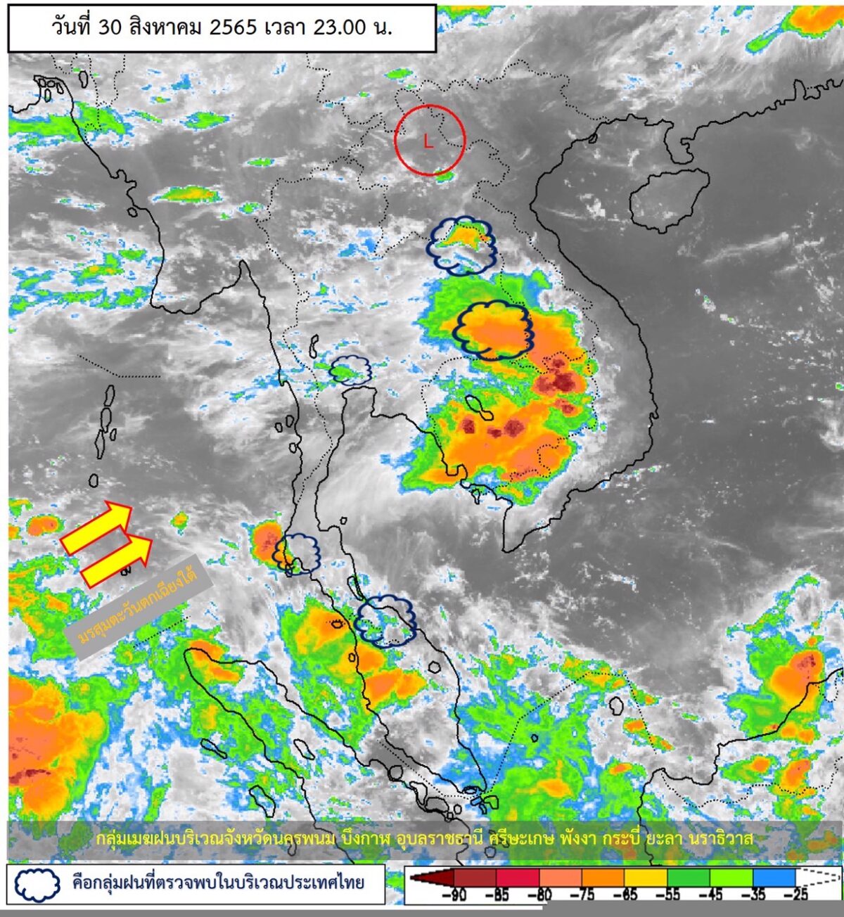 ลักษณะอากาศทั่วไป พยากรณ์อากาศ 24 ชั่วโมงข้างหน้า ลมตะวันออกเฉียงใต้พัดปกคลุมภาคตะวันออกเฉียงเหนือตอนล่าง ภาคตะวันออก ภาคใต้ และอ่าวไทย ประกอบกับมรสุมตะวันตกเฉียงใต้กำลังอ่อน พัดปกคลุมทะเลอันดามันตอนล่าง ลักษณะเช่นนี้ทำให้บริเวณดังกล่าว มีฝนฟ้าคะนองเกิดขึ้นและมีฝนตกหนักบางแห่งบริเวณภาคใต้ ขอให้ประชาชนในบริเวณดังกล่าว ระวังอันตรายจากฝนตกหนักที่เกิดขึ้นในระยะนี้ไว้ด้วย