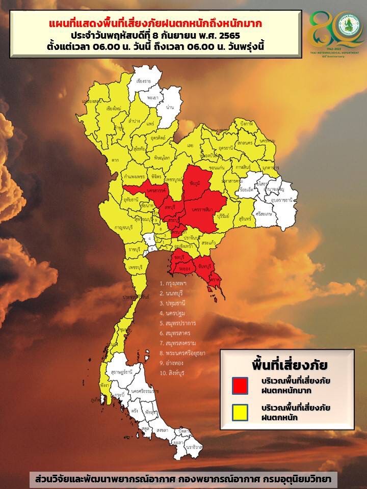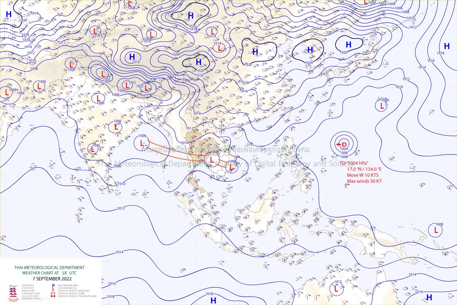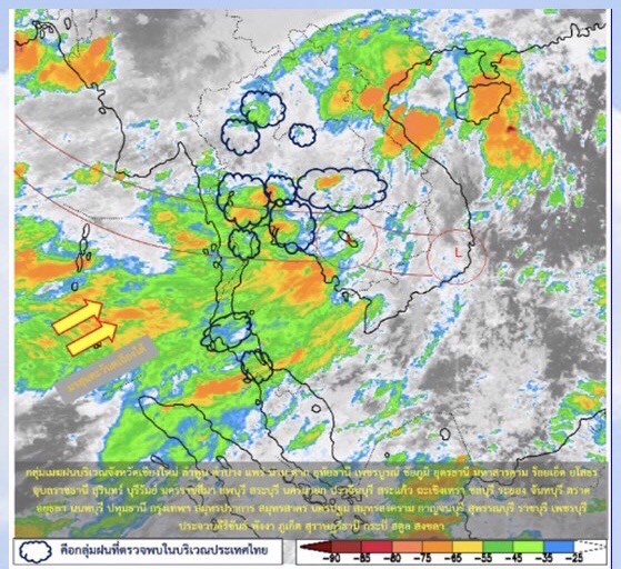 ลักษณะอากาศทั่วไป พยากรณ์อากาศ 24 ชั่วโมงข้างหน้า บริเวณความกดอากาศสูงจากประเทศจีนแผ่ปกคลุมภาคเหนือตอนบน และประเทศลาวตอนบน ส่งผลทำให้ร่องมรสุมกำลังแรงเลื่อนลงมาพาดผ่านภาคกลาง ภาคตะวันออกเฉียงเหนือตอนล่าง และภาคตะวันออก เข้าสู่หย่อมความกดอากาศต่ำ บริเวณประเทศกัมพูชาและเวียดนามตอนใต้ ประกอบกับมรสุมตะวันตกเฉียงใต้กำลังค่อนข้างแรง พัดปกคลุมทะเลอันดามัน ภาคใต้ และอ่าวไทย ลักษณะเช่นนี้ทำให้ภาคเหนือ ภาคตะวันออกเฉียงเหนือ ภาคกลาง รวมทั้งกรุงเทพมหานครและปริมณฑล ภาคตะวันออก และภาคใต้ มีฝนตกหนักถึงหนักมากบางแห่ง ขอให้ประชาชนในบริเวณดังกล่าว ระวังอันตรายจากฝนตกหนักถึงหนักมาก และฝนที่ตกสะสมซึ่งอาจทำให้เกิดน้ำท่วมฉับพลันและน้ำป่าไหลหลาก โดยเฉพาะพื้นที่ลาดเชิงเขาใกล้ทางน้ำไหลผ่านและพื้นที่ลุ่ม