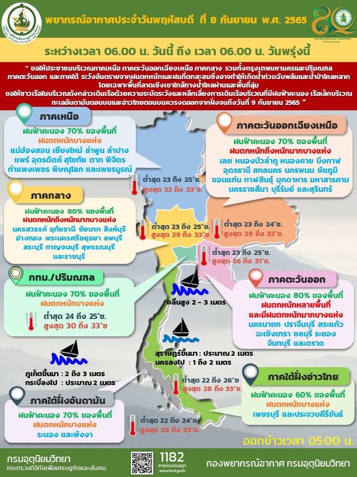 สำหรับคลื่นลมบริเวณทะเลอันดามันตอนบนและอ่าวไทยตอนบนมีกำลังค่อนข้างแรง โดยมีคลื่นสูง 2-3 เมตร บริเวณที่มีฝนฟ้าคะนองคลื่นสูงมากกว่า 3 เมตรขอให้ชาวเรือในบริเวณดังกล่าวเดินเรือด้วยความระมัดระวังและหลีกเลี่ยงการเดินเรือบริเวณที่มีฝนฟ้าคะนอง เรือเล็กบริเวณทะเลอันดามันตอนบนและอ่าวไทยตอนบน ควรงดออกจากฝั่งจนถึงวันที่ 9 กันยายน 2565