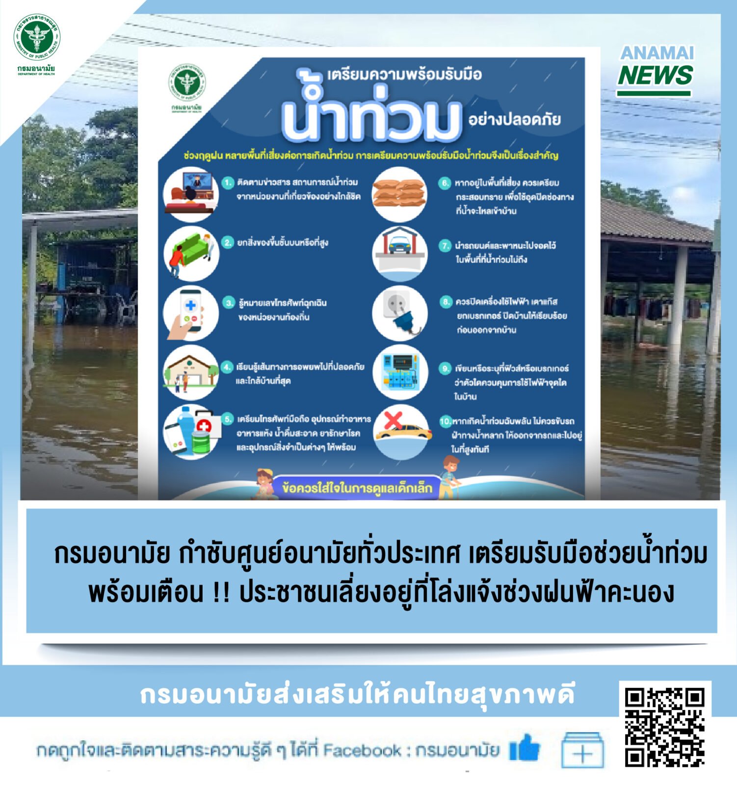 กรมอนามัย กระทรวงสาธารณสุข กำชับศูนย์อนามัยทั่วประเทศ เตรียมพร้อมด้านบุคลากร และอุปกรณ์ ด้านอนามัยสิ่งแวดล้อม รับมือช่วยน้ำท่วมในพื้นที่เสี่ยง พร้อมเตือนประชาชน เลี่ยงอยู่ที่โล่งแจ้ง ติดตามสถานการณ์ ช่องทางสื่อสารต่างๆ อย่างใกล้ชิด
