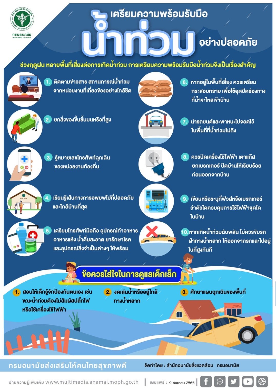 นายแพทย์สุวรรณชัย วัฒนายิ่งเจริญชัย อธิบดีกรมอนามัย กล่าวว่า จากสถานการณ์ร่องมรสุมจะเลื่อนลงมาพาดผ่านภาคเหนือตอนล่าง ภาคตะวันออกเฉียงเหนือตอนบน และภาคกลางตอนบน ประกอบกับมรสุม ตะวันตกเฉียงใต้ที่พัดปกคลุมทะเลอันดามัน และอ่าวไทย ทำให้มีฝนเพิ่มขึ้น หรือตกหนักในบางพื้นที่ ส่งผลให้ หลายพื้นที่มีฝนตกสะสม เกิดน้ำท่วม น้ำป่าไหลหลาก น้ำท่วมขัง น้ำล้นตลิ่งในพื้นที่เฝ้าระวัง ซึ่งในเบื้องต้น กรมอนามัยได้มอบหมายให้ศูนย์อนามัยทั่วประเทศเตรียมความพร้อมด้านบุคลากร อุปกรณ์ด้านอนามัยสิ่งแวดล้อมรองรับกรณีที่เกิดอุทกภัยในพื้นที่เสี่ยง เช่น จัดเตรียมชุดนายสะอาด การจัดการสุขาภิบาลอาหาร การจัดการขยะ จัดหาน้ำสะอาด นอกจากนี้ ได้ย้ำเตือนให้ประชาชนควรระมัดระวังสัตว์และแมลงมีพิษที่มากับน้ำท่วม รวมถึงการใช้ไฟฟ้าภายในบ้านหรือบริเวณบ้าน หากน้ำกำลังท่วม ให้ปลดสวิตช์หรือเบรกเกอร์เมน เพื่อตัดกระแสไฟฟ้า
