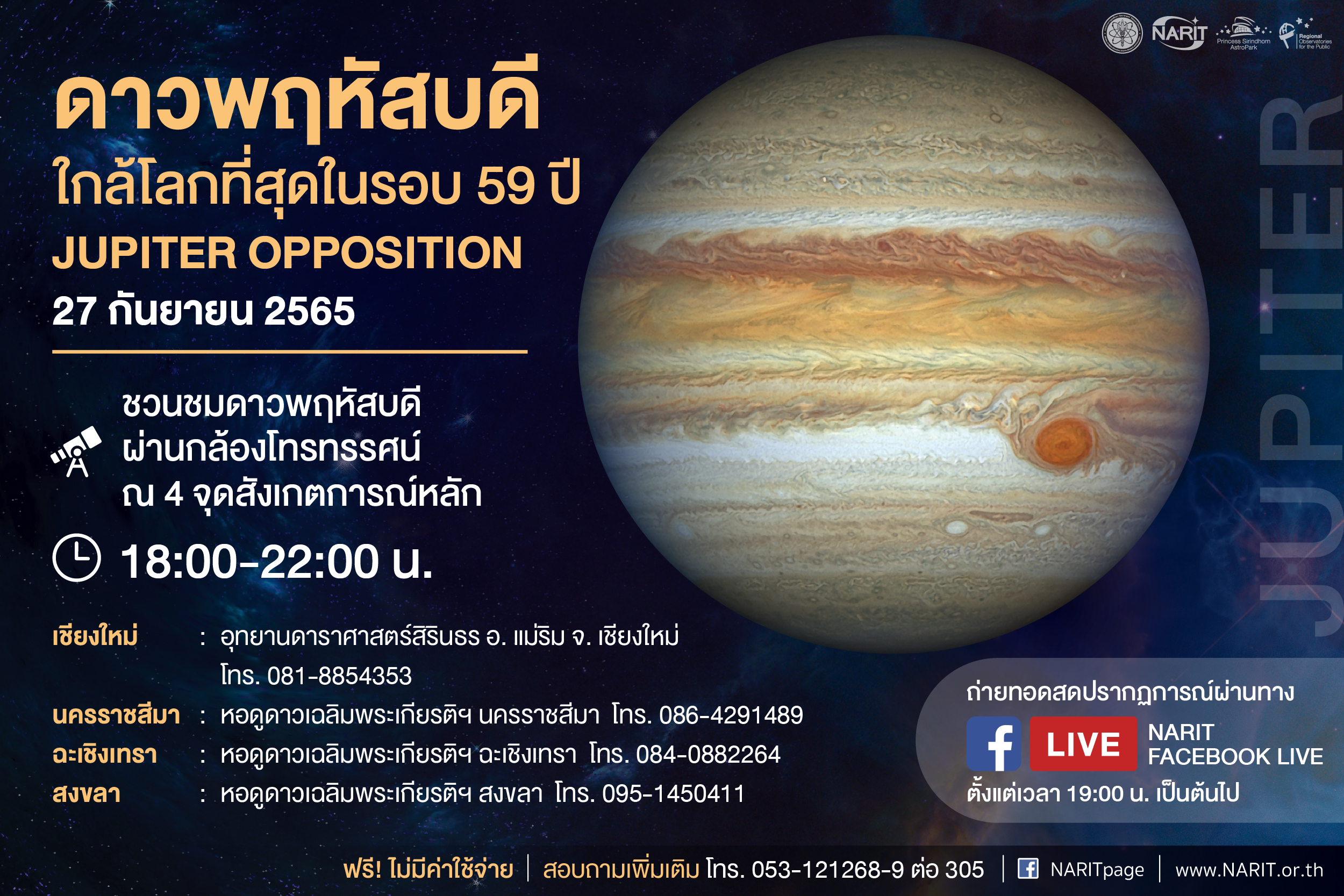 นายศุภฤกษ์ คฤหานนท์ ผู้อำนวยการศูนย์บริการวิชาการทางดาราศาสตร์ สดร. เปิดเผยว่า วันที่ 27 กันยายน 2565 ดาวพฤหัสบดีจะโคจรเข้ามาอยู่ในตำแหน่งตรงข้ามดวงอาทิตย์ ดวงอาทิตย์ โลก และดาวพฤหัสบดีจะเรียงตัวอยู่ในแนวเดียวกันโดยมีโลกอยู่ตรงกลาง เป็นตำแหน่งใกล้โลกที่สุดในรอบปี ห่างจากโลกประมาณ 591 ล้านกิโลเมตร ปกติแล้วดาวพฤหัสบดีจะโคจรมาใกล้โลกทุกปี และครั้งนี้ยังถือเป็นการโคจรเข้าใกล้โลกที่สุดในรอบ 59 ปี นับตั้งแต่เดือนตุลาคม พ.ศ. 2506 อีกด้วย