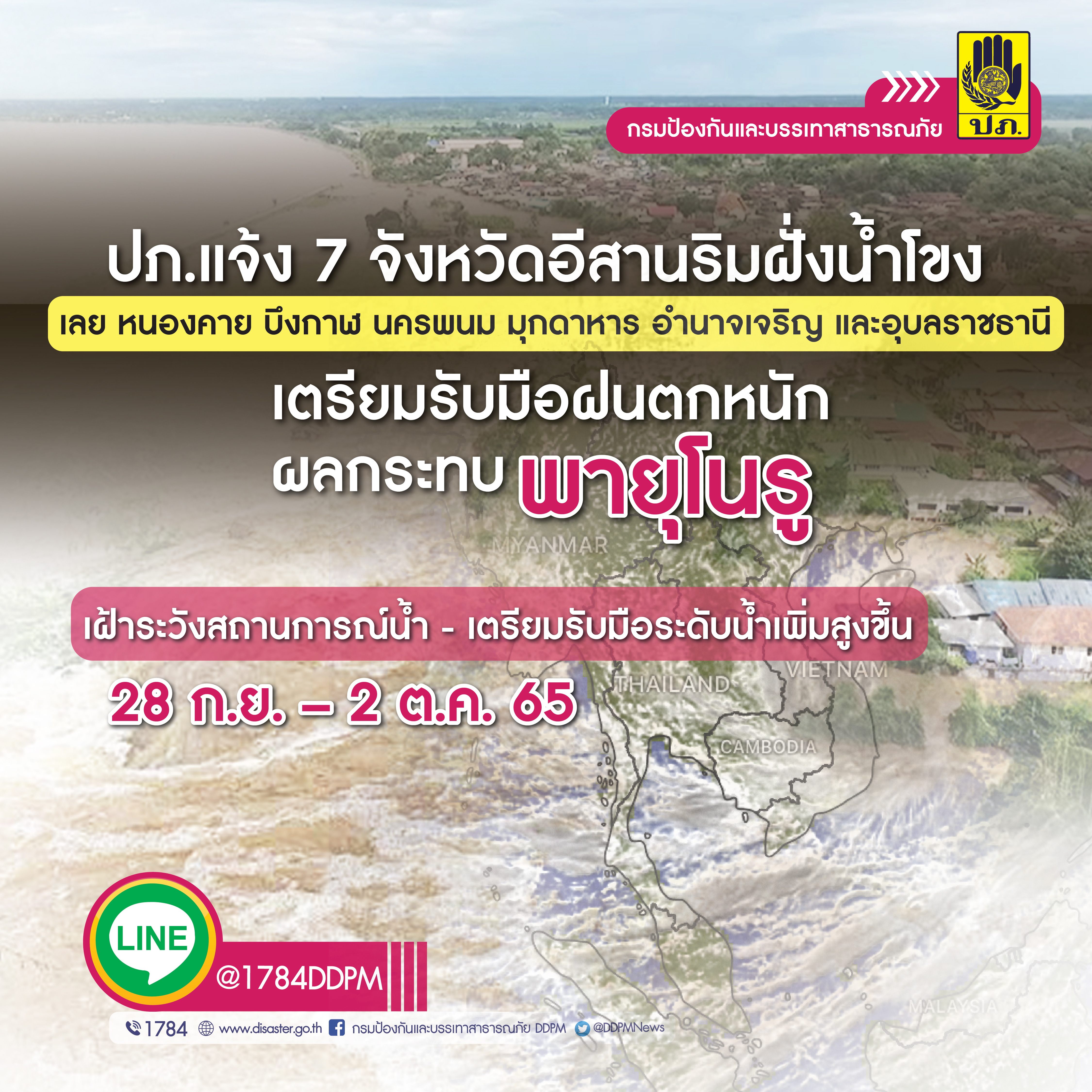 กรมป้องกันและบรรเทาสาธารณภัย (ปภ.) ในฐานะกองอำนวยการป้องกันและบรรเทาสาธารณภัยกลาง (กอปภ.ก.) ได้ติดตามข้อมูลสถานการณ์น้ำท่าและปริมาณน้ำในอ่างเก็บน้ำ ประกอบกับกองอำนวยการน้ำแห่งชาติได้มีประกาศ ฉบับที่ 42/2565 ลงวันที่ 26 กันยายน 2565 แจ้งว่า ได้ติดตามสถานการณ์น้ำแม่น้ำโขง พบว่า พายุไต้ฝุ่น “โนรู” บริเวณทะเลจีนใต้ตอนกลาง คาดว่า